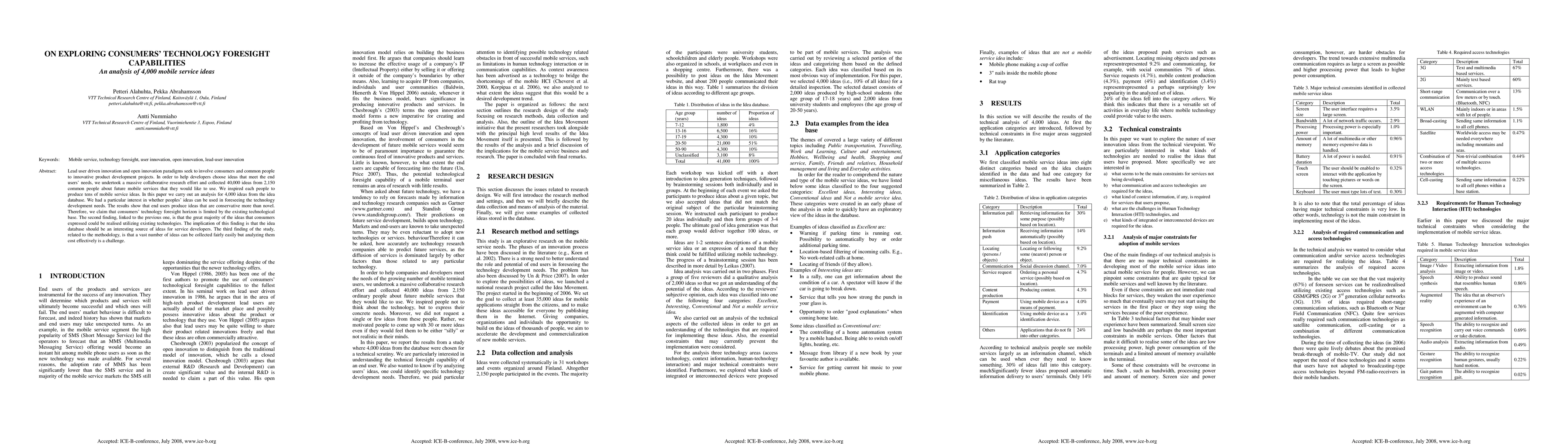 The study analyzed 4000 mobile service ideas from 2150 individuals, finding that consumer technology foresight is limited by current technological base, most ideas could be implemented with existing tech, but analyzing large idea sets is challenging.