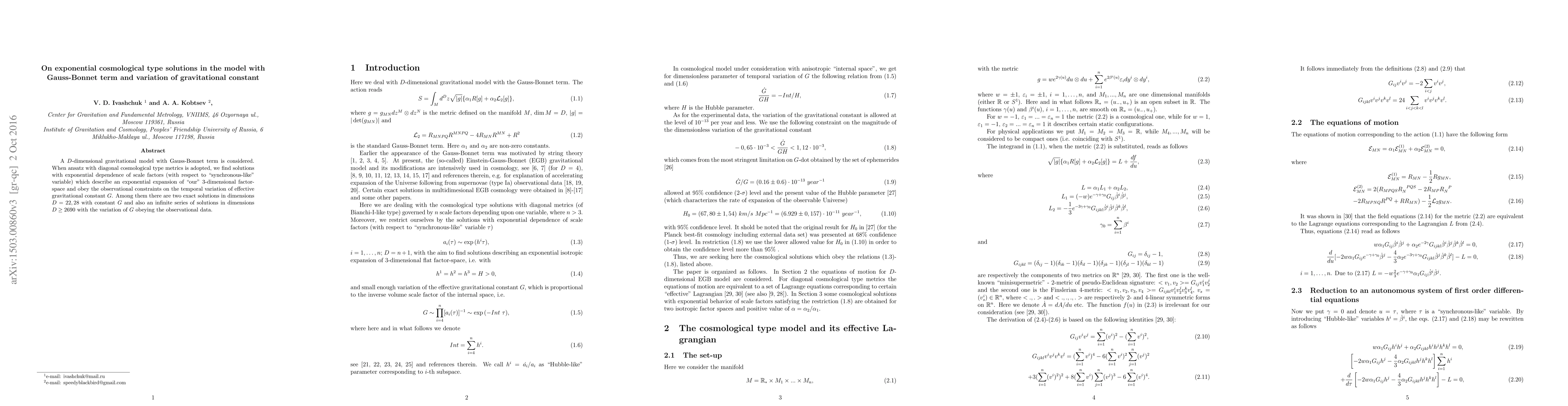 A D-dimensional gravitational model with Gauss-Bonnet term is considered. When ansatz with diagonal cosmological type metrics is adopted, we find solutions with exponential dependence of scale factors (with respect to "synchronous-like" variable) which describe an exponential expansion of "our" 3-dimensional factor-space and obey the observational constraints on the temporal variation of effective gravitational constant G. Among them there are two exact solutions in dimensions D = 22, 28 with constant G and also an infinite series of solutions in dimensions D \ge 2690 with the variation of G obeying the observational data.