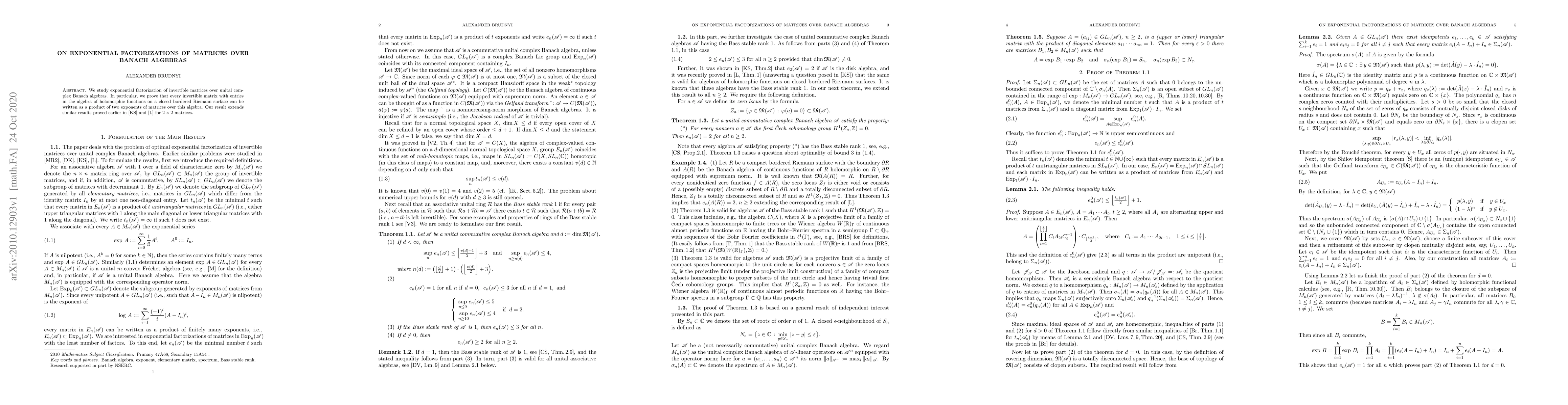 We study exponential factorization of invertible matrices over unital complex Banach algebras. In particular, we prove that every invertible matrix with entries in the algebra of holomorphic functions on a closed bordered Riemann surface can be written as a product of two exponents of matrices over this algebra. Our result extends similar results proved earlier in [KS] and [L] for $2\times 2$ matrices.