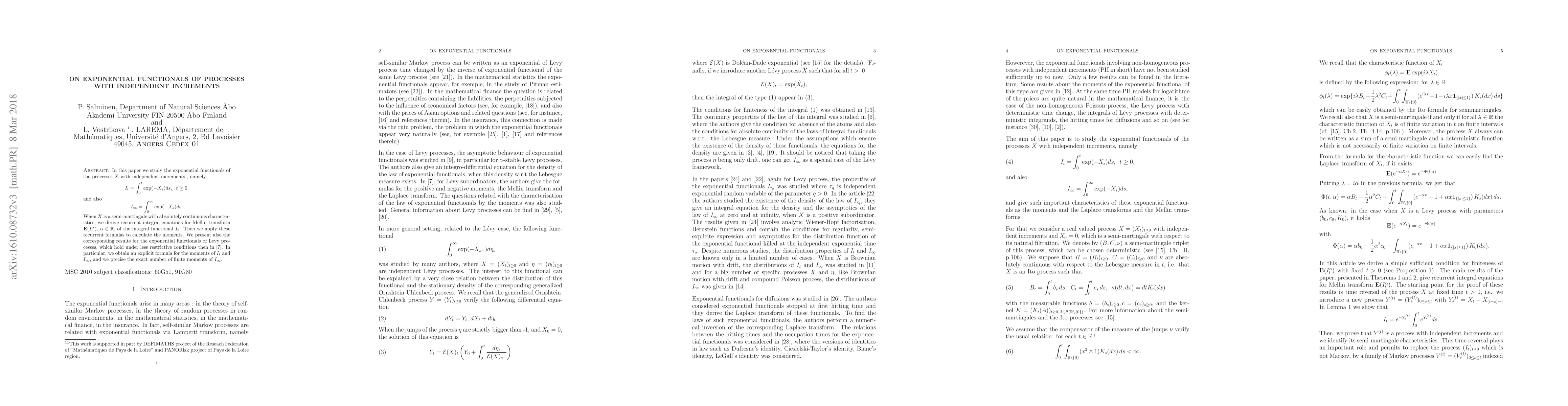 This paper investigates exponential functionals of processes with independent increments, deriving recurrent integral equations for the Mellin transform of integral functionals. It also provides explicit formulas for the moments of these functionals under less restrictive conditions than previous studies.