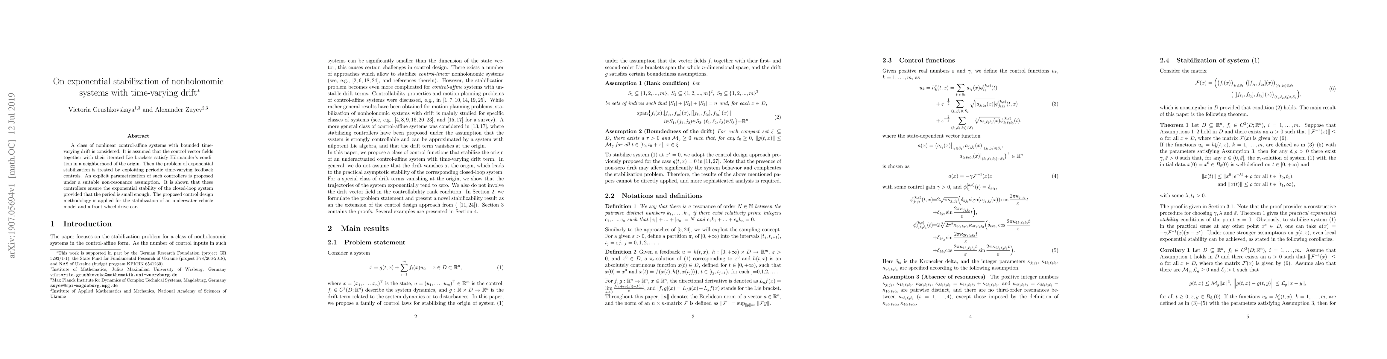 This paper proposes a method for exponential stabilization of nonholonomic systems with time-varying drift using periodic time-varying feedback controls, ensuring stability under a small period condition. The approach is demonstrated through the stabilization of an underwater vehicle and a front-wheel drive car.