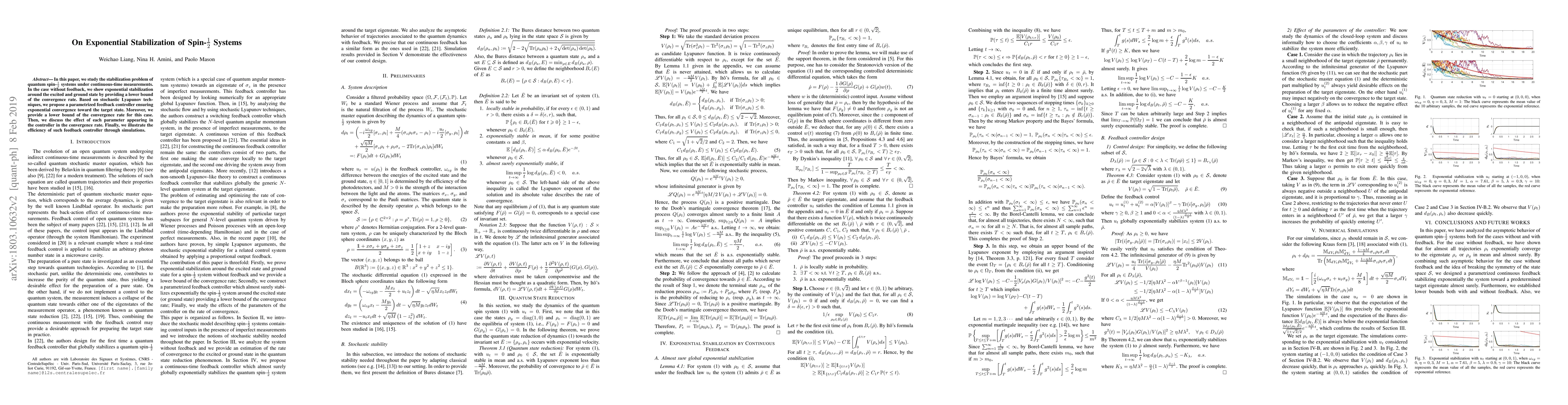 Researchers develop a measurement-based feedback control to stabilize quantum spin-1/2 systems exponentially, providing a lower bound for the convergence rate and exploring its sensitivity to system parameters.