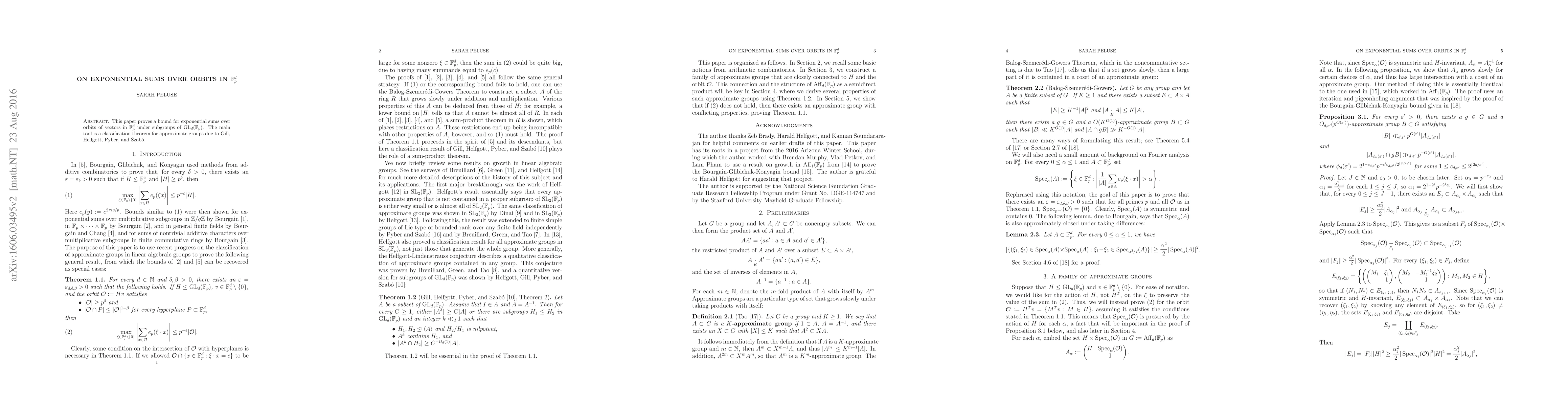 This paper proves a bound for exponential sums over orbits of vectors in $\mathbb{F}_p^d$ under subgroups of $\rm{GL}_d(\mathbb{F}_p)$. The main tool is a classification theorem for approximate groups due to Gill, Helfgott, Pyber, and Szab\'o.
