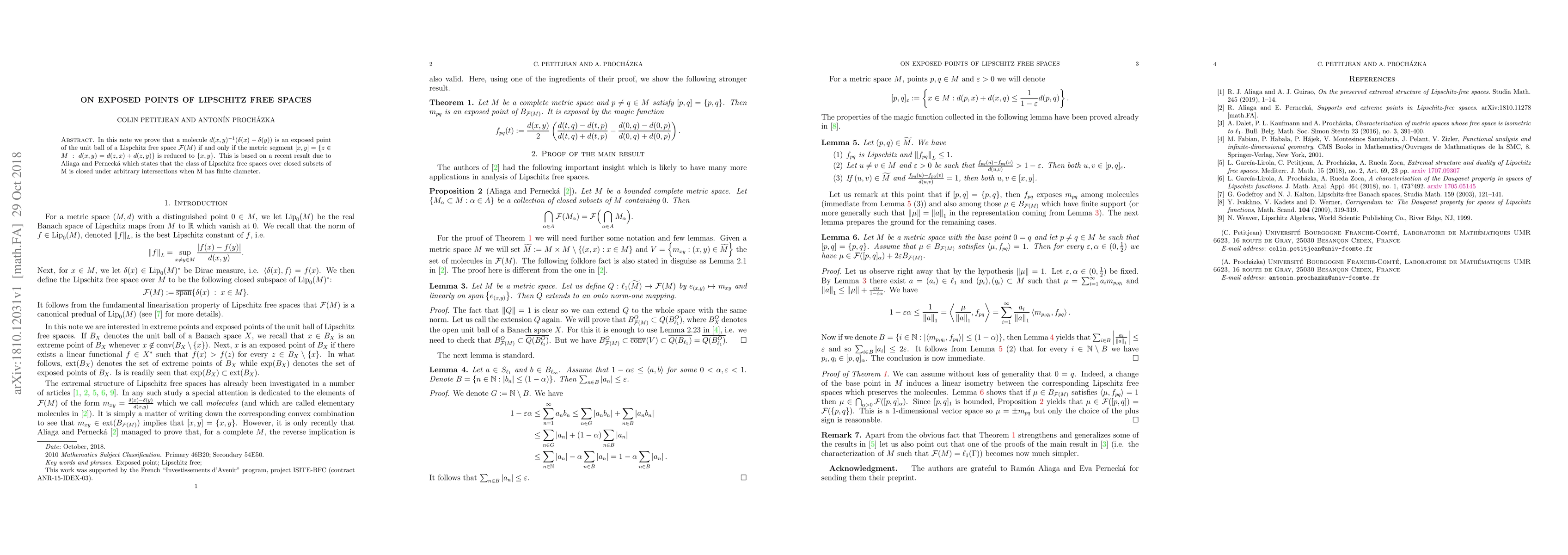 In this note we prove that a molecule $d(x,y)^{-1}(\delta(x)-\delta(y))$ is an exposed point of the unit ball of a Lispchitz free space $\mathcal F(M)$ if and only if the metric segment $[x,y]=\{z \in M \; : \; d(x,y)=d(z,x)+d(z,y) \}$ is reduced to $\{x,y\}$. This is based on a recent result due to Aliaga and Perneck\'a which states that the class of Lipschitz free spaces over closed subsets of M is closed under arbitrary intersections when M has finite diameter.