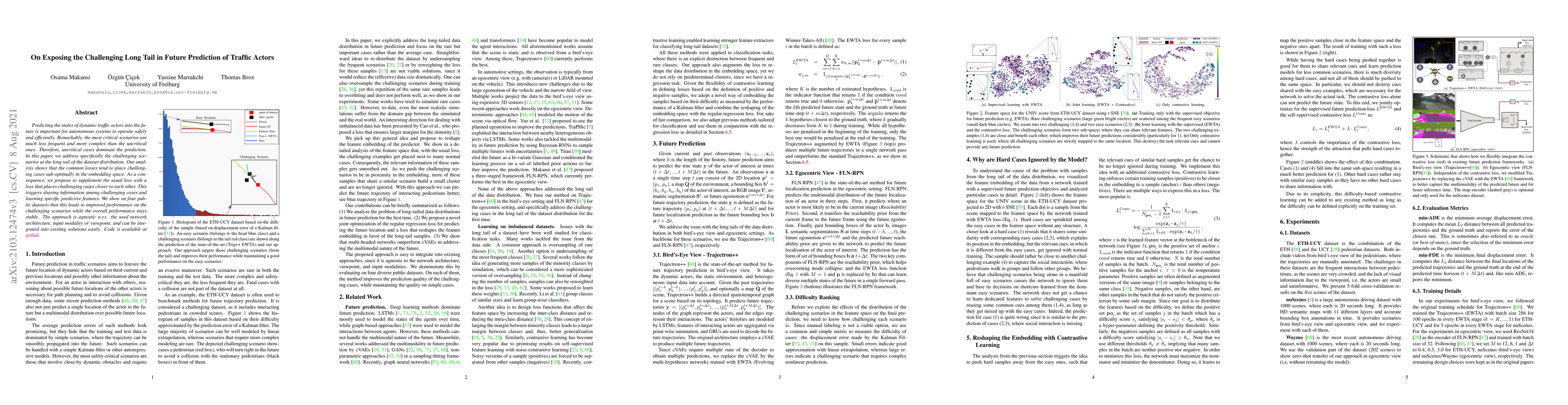 Predicting the states of dynamic traffic actors into the future is important for autonomous systems to operate safelyand efficiently. Remarkably, the most critical scenarios aremuch less frequent and more complex than the uncriticalones. Therefore, uncritical cases dominate the prediction. In this paper, we address specifically the challenging scenarios at the long tail of the dataset distribution. Our analysis shows that the common losses tend to place challenging cases suboptimally in the embedding space. As a consequence, we propose to supplement the usual loss with aloss that places challenging cases closer to each other. This triggers sharing information among challenging cases andlearning specific predictive features. We show on four public datasets that this leads to improved performance on the challenging scenarios while the overall performance stays stable. The approach is agnostic w.r.t. the used network architecture, input modality or viewpoint, and can be integrated into existing solutions easily. Code is available at https://github.com/lmb-freiburg/Contrastive-Future-Trajectory-Prediction