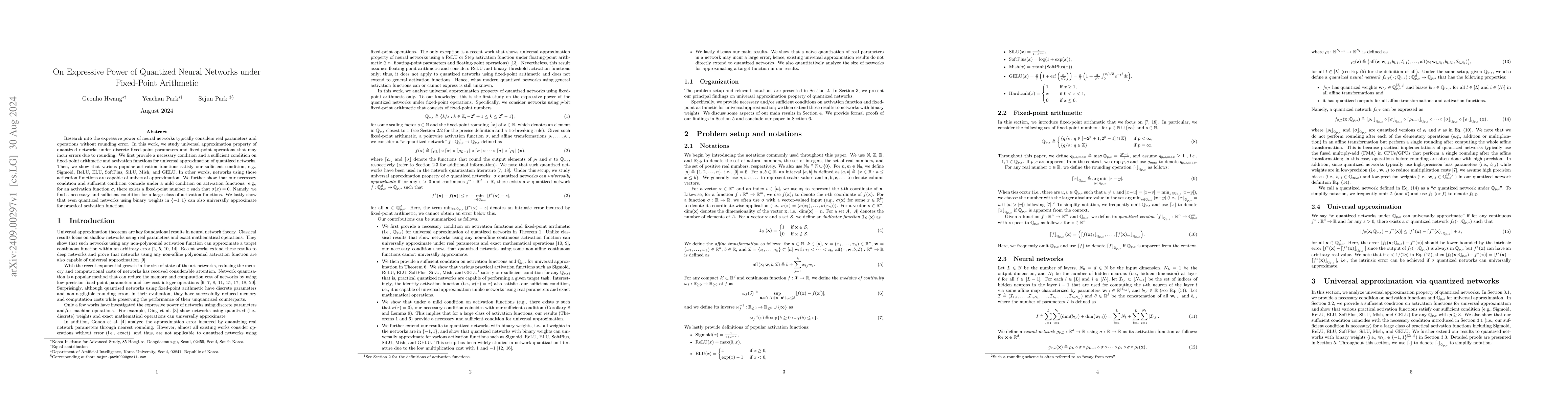 This paper investigates the universal approximation property of quantized neural networks under fixed-point arithmetic, proving necessary and sufficient conditions for approximation with various activation functions. It concludes that popular activations like Sigmoid, ReLU, and others maintain universal approximation, even when using binary weights.