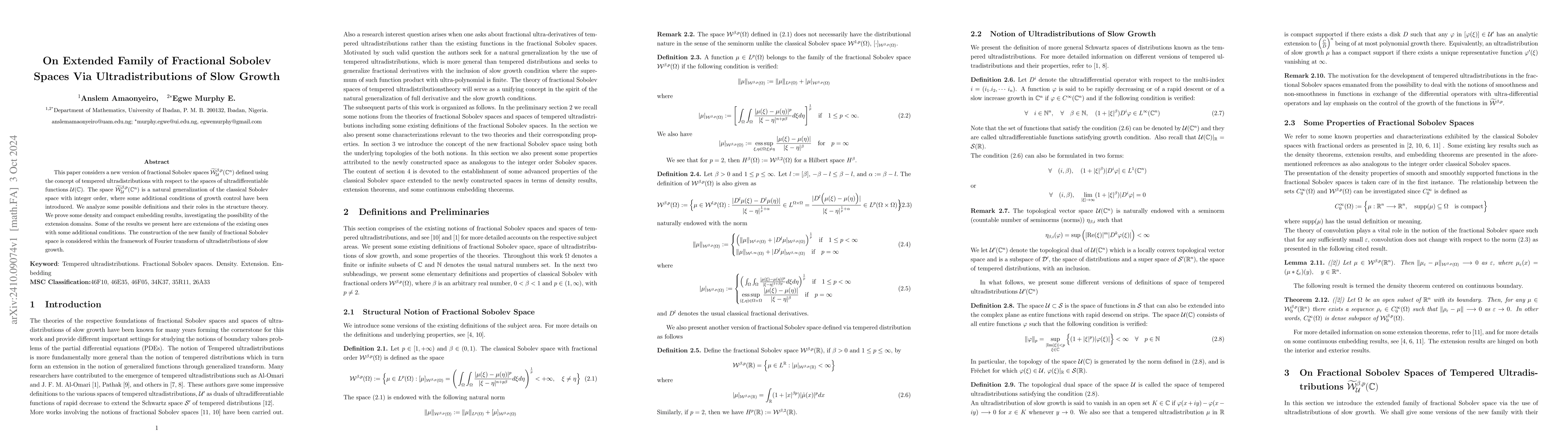 This paper considers a new version of fractional Sobolev spaces $\widetilde{\mathcal{W}}_{\mathcal{U}}^{\beta,p}(\mathbb{C}^{n})$ defined using the concept of tempered ultradistributions with respect to the spaces of ultradifferentiable functions $\mathcal{U}(\mathbb{C})$. The space $\widetilde{\mathcal{W}}_{\mathcal{U}}^{\beta,p}(\mathbb{C}^{n})$ is a natural generalization of the classical Sobolev space with integer order, where some additional conditions of growth control have been introduced. We analyze some possible definitions and their roles in the structure theory. We prove some density and compact embedding results, investigating the possibility of the extension domains. Some of the results we present here are extensions of the existing ones with some additional conditions. The construction of the new family of fractional Sobolev space is considered within the framework of Fourier transform of ultradistributions of slow growth.