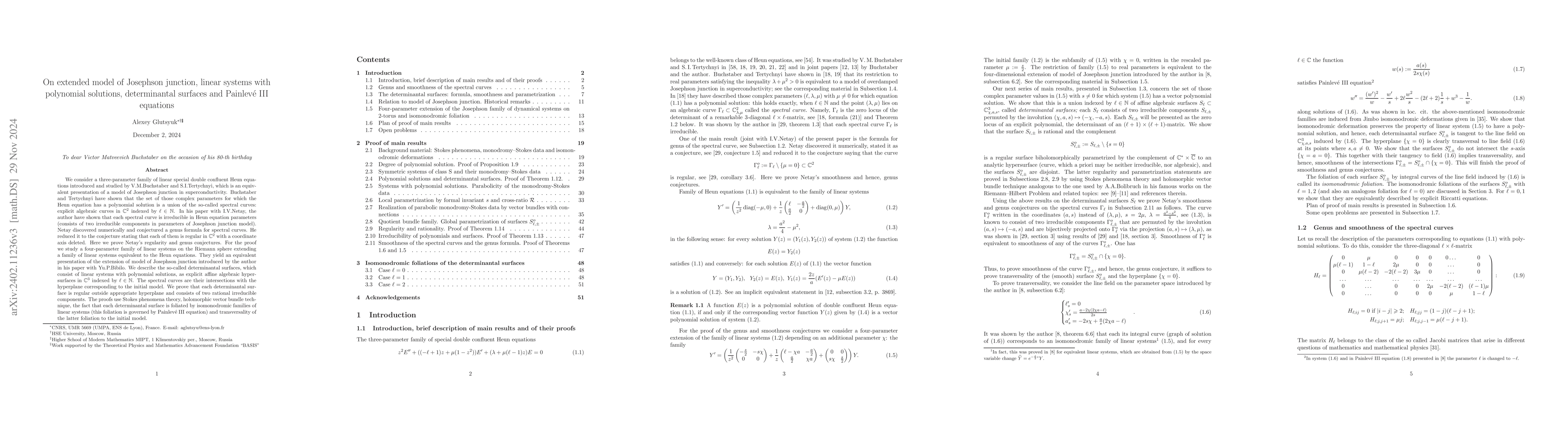 This paper proves Netay's conjectures regarding the regularity and genus of spectral curves related to a 3-parameter model of a Josephson junction, using techniques from Stokes phenomena, vector bundles, and Painlevé equations. It also introduces determinantal surfaces linked to linear systems with polynomial solutions.