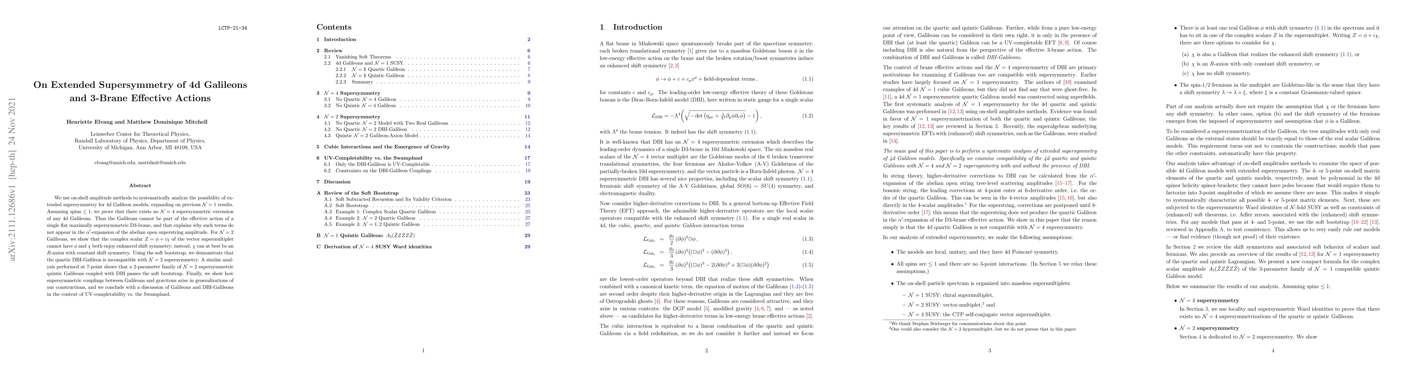 We use on-shell amplitude methods to systematically analyze the possibility of extended supersymmetry for 4d Galileon models, expanding on previous $\mathcal{N}=1$ results. Assuming spins $\le 1$, we prove that there exists no $\mathcal{N}=4$ supersymmetric extension of any 4d Galileons. Thus the Galileons cannot be part of the effective action of a single flat maximally supersymmetric D3-brane, and that explains why such terms do not appear in the $\alpha'$-expansion of the abelian open superstring amplitude. For $\mathcal{N}=2$ Galileons, we show that the complex scalar $Z = \phi + i \chi$ of the vector supermultiplet cannot have $\phi$ and $\chi$ both enjoy enhanced shift symmetry; instead, $\chi$ can at best be an $R$-axion with constant shift symmetry. Using the soft bootstrap, we demonstrate that the quartic DBI-Galileon is incompatible with $\mathcal{N}=2$ supersymmetry. A similar analysis performed at 7-point shows that a 2-parameter family of $\mathcal{N}=2$ supersymmetric quintic Galileons coupled with DBI passes the soft bootstrap. Finally, we show how supersymmetric coup\-lings between Galileons and gravitons arise in generalizations of our constructions, and we conclude with a discussion of Galileons and DBI-Galileons in the context of UV-completability vs.~the Swampland.