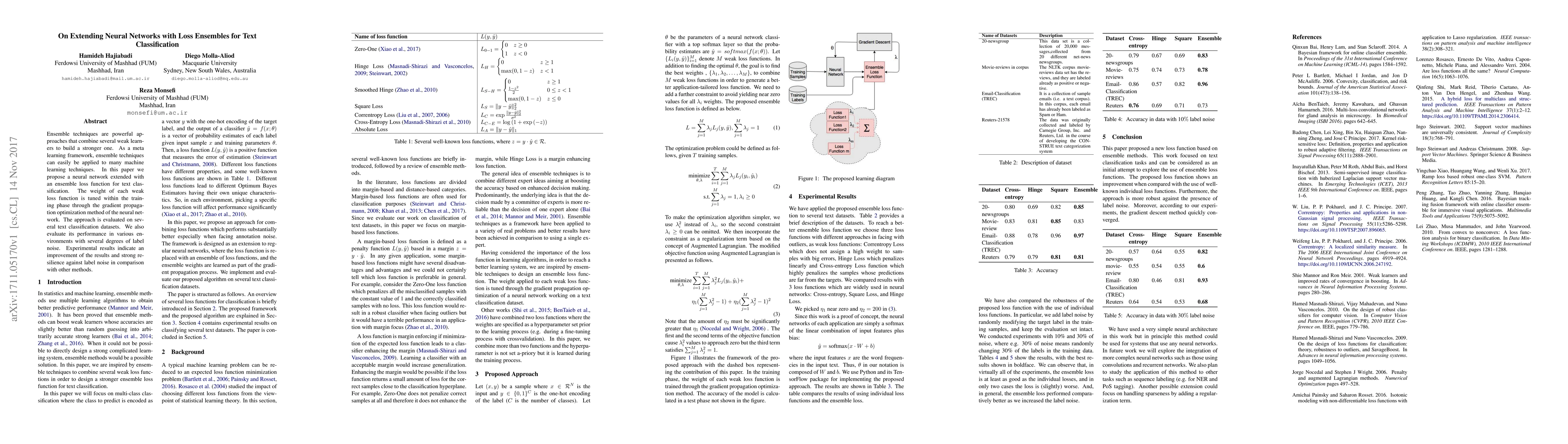 This paper proposes a neural network enhanced with an ensemble loss function for text classification, optimizing the weights of each loss function during training. Experimental results show improved performance and greater resilience to label noise compared to other methods.