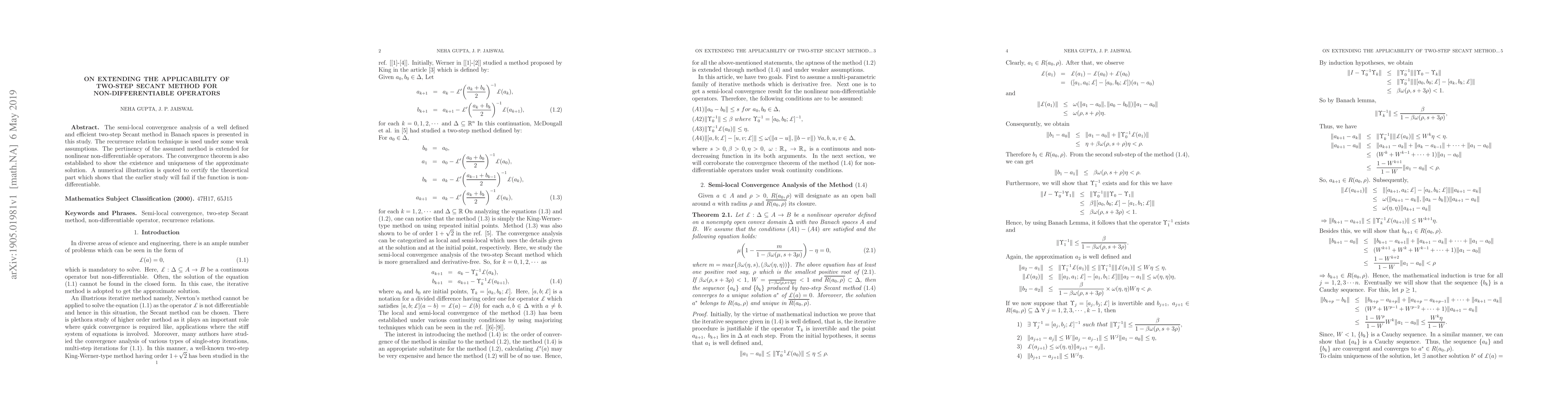 The semi-local convergence analysis of a well defined and efficient two-step Secant method in Banach spaces is presented in this study. The recurrence relation technique is used under some weak assumptions. The pertinency of the assumed method is extended for nonlinear non-differentiable operators. The convergence theorem is also established to show the existence and uniqueness of the approximate solution. A numerical illustration is quoted to certify the theoretical part which shows that the earlier study will fail if the function is non-differentiable.