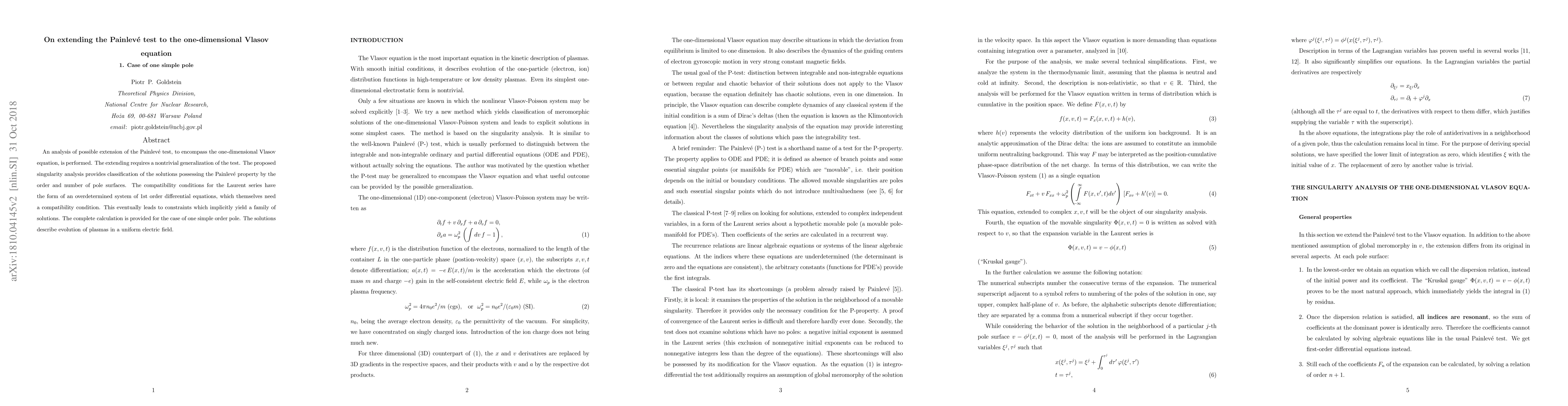 An analysis of possible extension of the Painlev\'e test, to encompass the one-dimensional Vlasov equation, is performed. The extending requires a nontrivial generalization of the test. The proposed singularity analysis provides classification of the solutions possessing the Painlev\'e property by the order and number of pole surfaces. The compatibility conditions for the Laurent series have the form of an overdetermined system of 1st order differential equations, which themselves need a compatibility condition. This eventually leads to constraints which implicitly yield a family of solutions. The complete calculation is provided for the case of one simple order pole. The solutions describe evolution of plasmas in a uniform electric field.