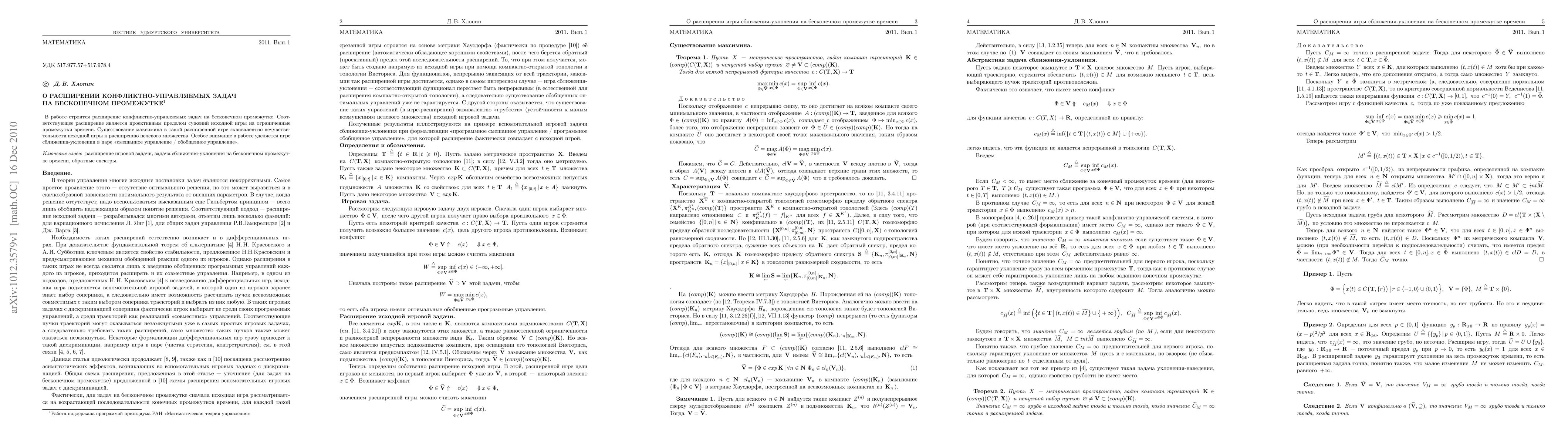 The extension of a conflict control problem with infinite horizon is constructed. This extension is the projective limit of restricted games. Relations between "sensitivity to target set" and the existence of the optimal control are studied. Special attention is paid to the pursuit-evasion game with "joint control/relaxed control".