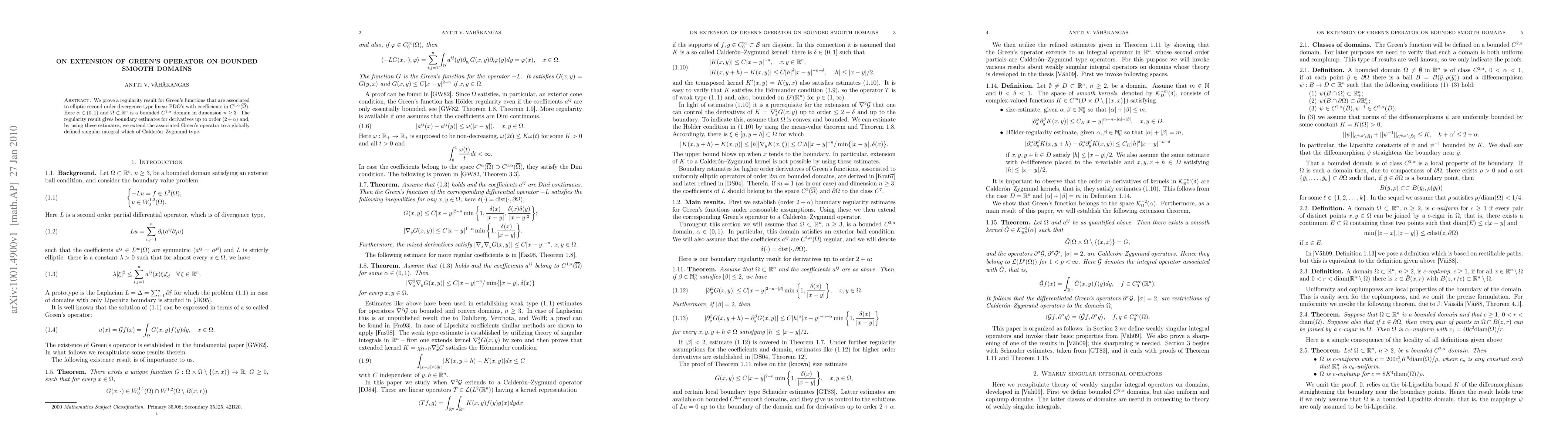 This research paper proves a regularity result for Green's functions associated with elliptic second-order linear partial differential operators on bounded smooth domains, extending the Green's operator to a globally defined singular integral of Calder–Zygmund type.