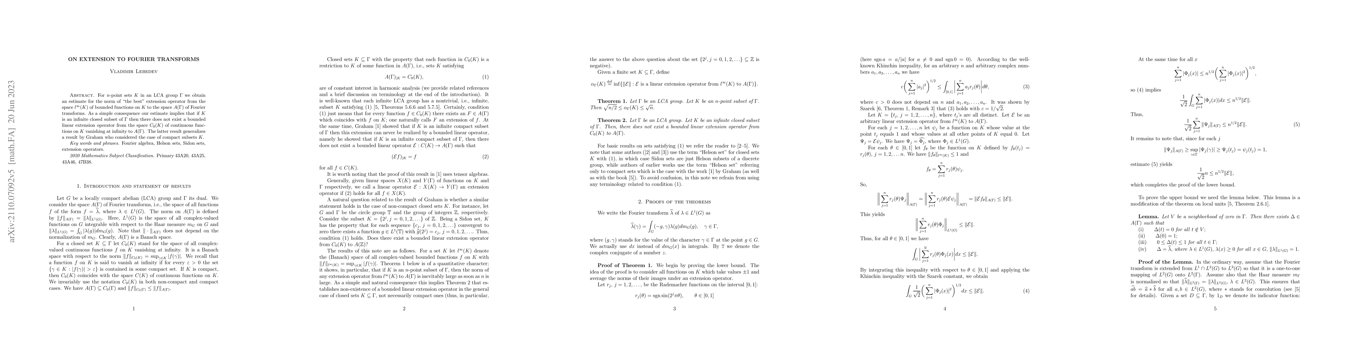For $n$-point sets $K$ in an LCA group $\Gamma$ we obtain an estimate for the norm of "the best" extension operator from the space $l^\infty(K)$ of bounded functions on $K$ to the space $A(\Gamma)$ of Fourier transforms. As a simple consequence our estimate implies that if $K$ is an infinite closed subset of $\Gamma$ then there does not exist a bounded linear extension operator from the space $C_0(K)$ of continuous functions on $K$ vanishing at infinity to $A(\Gamma)$. The latter result generalizes a result by Graham who considered the case of compact subsets $K$.