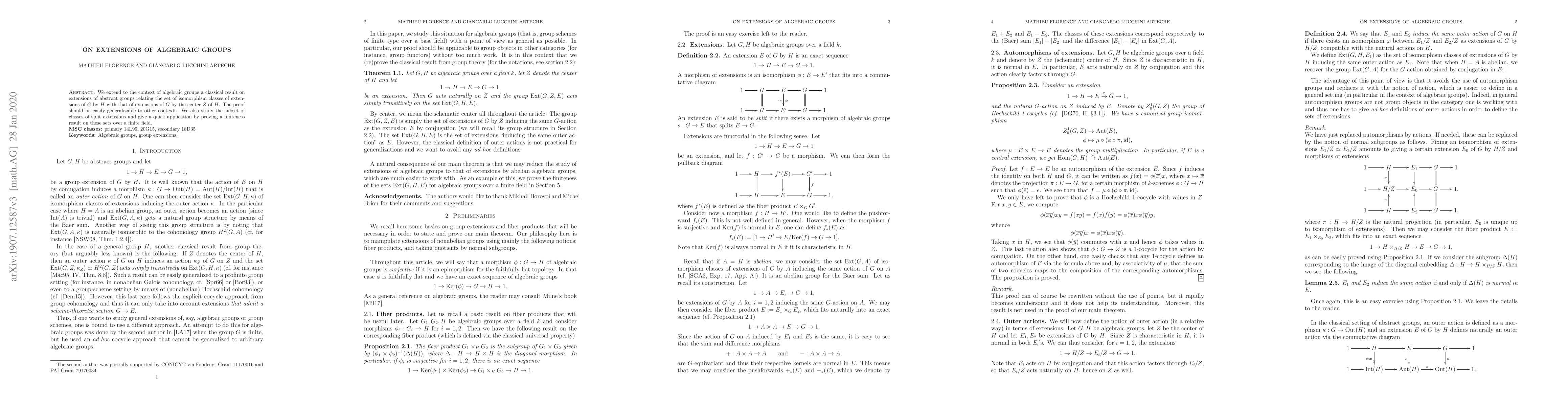 This paper extends a classical result on group extensions to algebraic groups, showing a correspondence between extensions of $G$ by $H$ and by $H$'s center $Z$. It also investigates split extensions and proves a finiteness result for these over a finite field.
