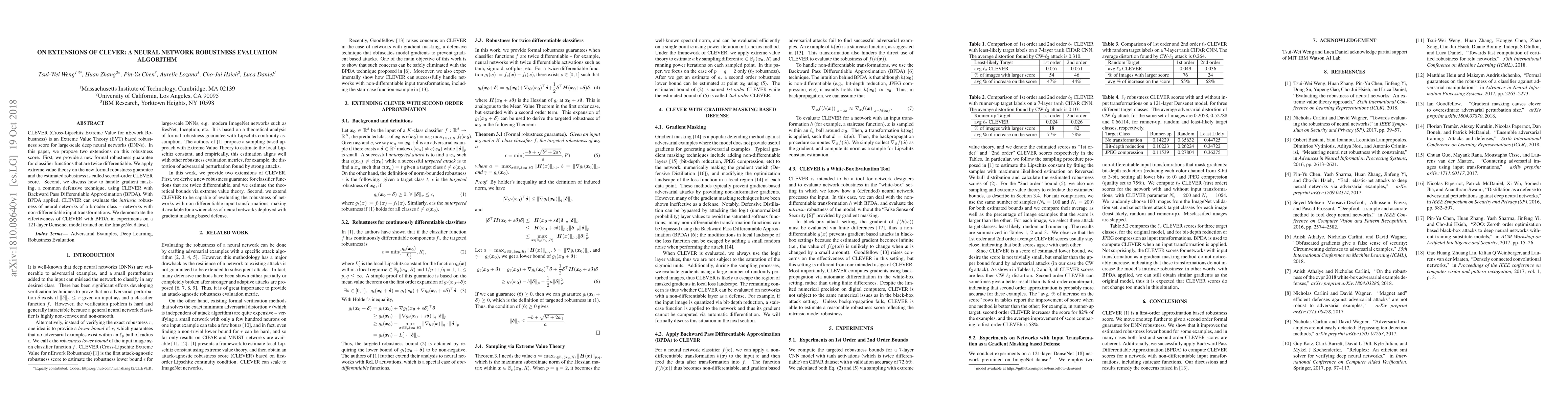 This paper extends the CLEVER algorithm for evaluating neural network robustness, introducing a second-order CLEVER score for twice differentiable classifiers and employing Backward Pass Differentiable Approximation (BPDA) to assess networks with non-differentiable transformations, demonstrating its effectiveness on a Densenet model.