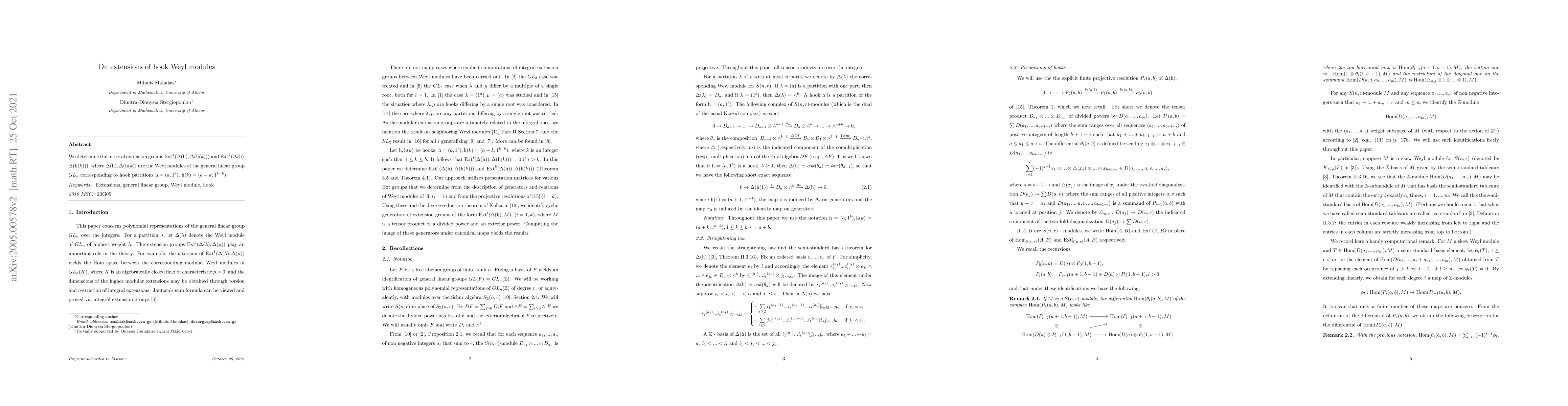 The paper provides detailed computations and proofs for extension groups of hook Weyl modules, including generators and relations.