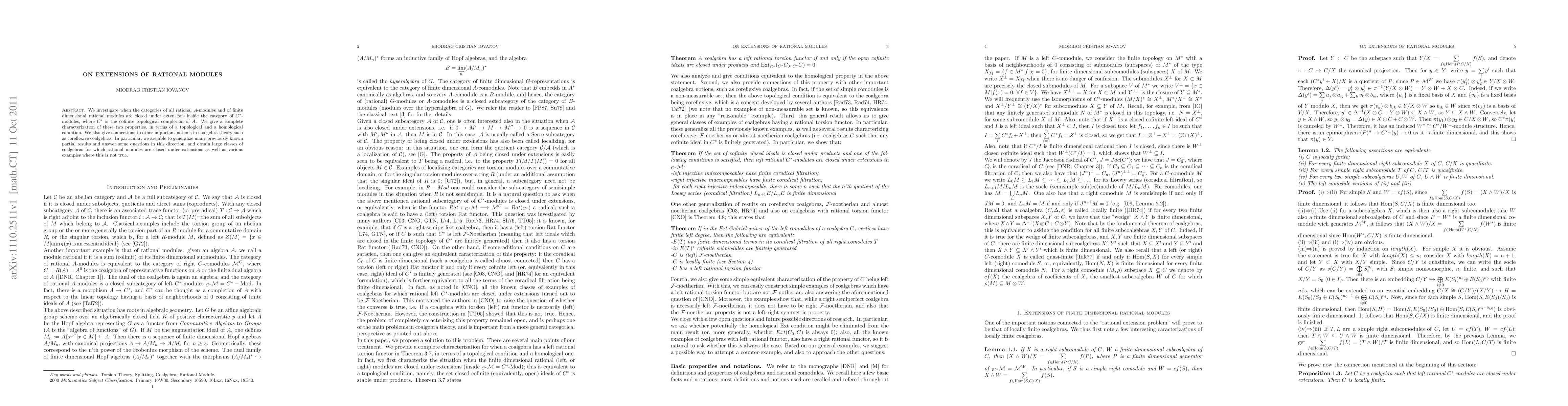 We investigate when the categories of all rational $A$-modules and of finite dimensional rational modules are closed under extensions inside the category of $C^*$-modules, where $C^*$ is the cofinite topological completion of $A$. We give a complete characterization of these two properties, in terms of a topological and a homological condition. We also give connections to other important notions in coalgebra theory such as coreflexive coalgebras. In particular, we are able to generalize many previously known partial results and answer some questions in this direction, and obtain large classes of coalgebras for which rational modules are closed under extensions as well as various examples where this is not true.