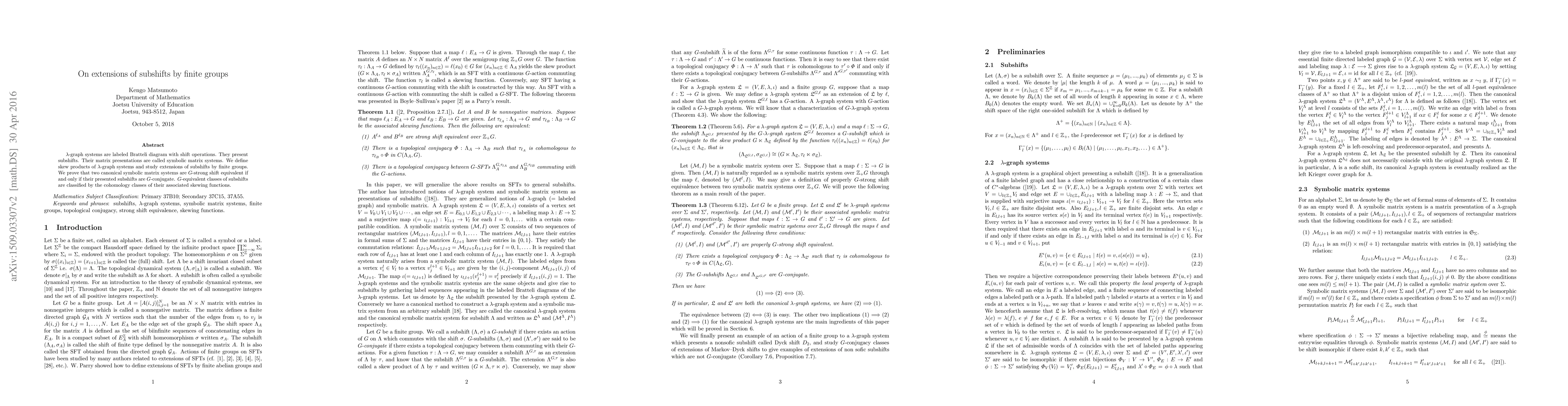 The research employs the study of λ-graph systems, which are labeled Bratteli diagrams with shift operations, to analyze subshifts. It introduces skew products of λ-graph systems and examines extensions of subshifts by finite groups, proving that two canonical symbolic matrix systems are $G$-strong shift equivalent if and only if their presented subshifts are $G$-conjugate. $G$-equivalence classes of subshifts are classified by the cohomology classes of their associated skewing functions.