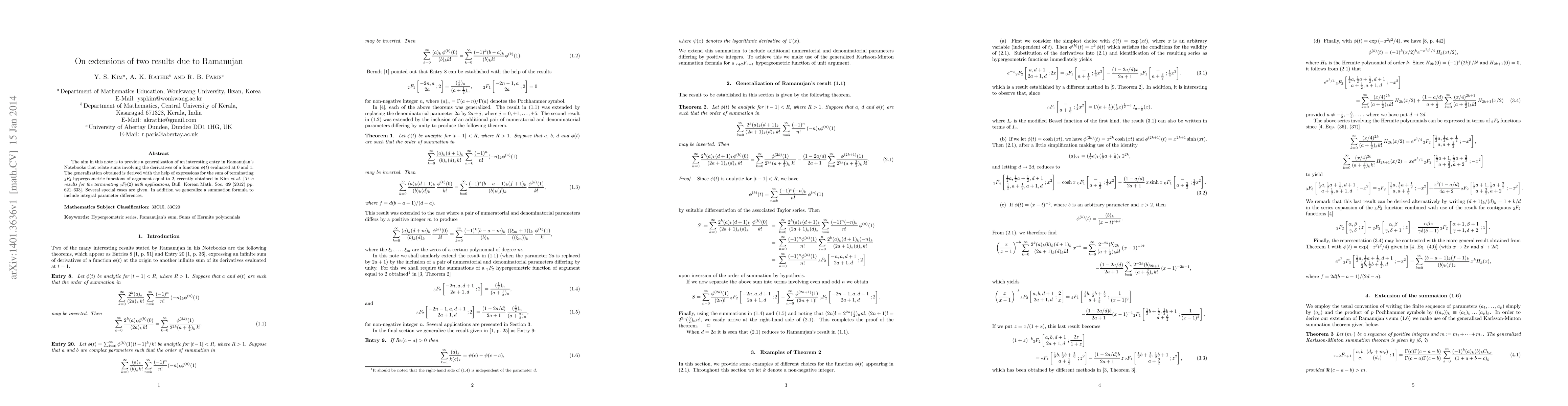 The aim in this note is to provide a generalization of an interesting entry in Ramanujan's Notebooks that relate sums involving the derivatives of a function Phi(t) evaluated at 0 and 1. The generalization obtained is derived with the help of expressions for the sum of terminating 3F2 hypergeometric functions of argument equal to 2, recently obtained in Kim et al. [Two results for the terminating 3F2(2) with applications, Bull. Korean Math. Soc. 49 (2012) pp. 621{633]. Several special cases are given. In addition we generalize a summation formula to include integral parameter differences.
