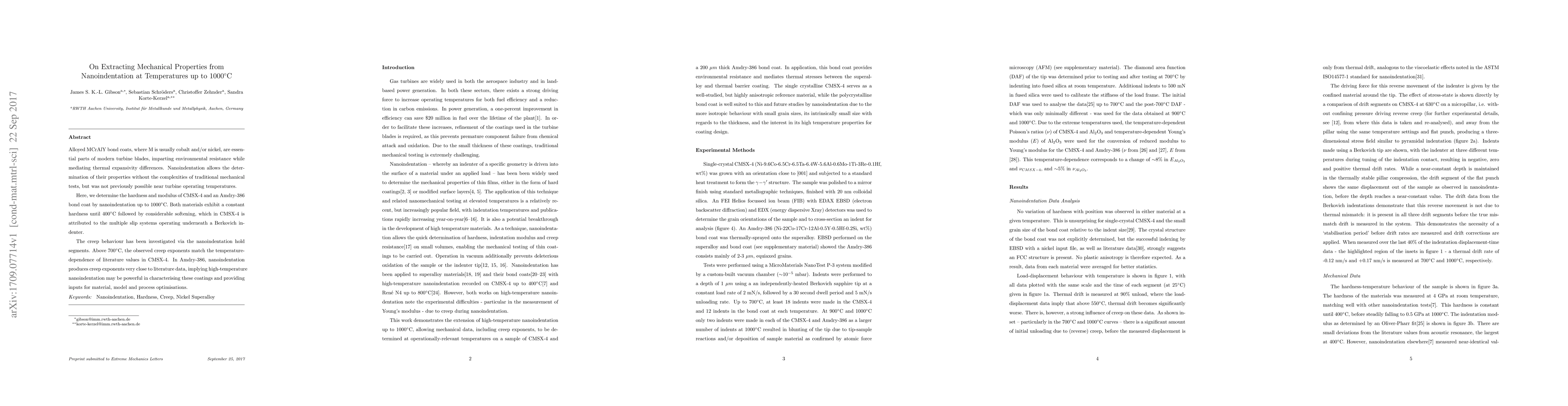 Alloyed MCrAlY bond coats, where M is usually cobalt and/or nickel, are essential parts of modern turbine blades, imparting environmental resistance while mediating thermal expansivity differences. Nanoindentation allows the determination of their properties without the complexities of traditional mechanical tests, but was not previously possible near turbine operating temperatures. Here, we determine the hardness and modulus of CMSX-4 and an Amdry-386 bond coat by nanoindentation up to 1000$^{\circ}$C. Both materials exhibit a constant hardness until 400$^{\circ}$C followed by considerable softening, which in CMSX-4 is attributed to the multiple slip systems operating underneath a Berkovich indenter. The creep behaviour has been investigated via the nanoindentation hold segments. Above 700$^{\circ}$C, the observed creep exponents match the temperature-dependence of literature values in CMSX-4. In Amdry-386, nanoindentation produces creep exponents very close to literature data, implying high-temperature nanoindentation may be powerful in characterising these coatings and providing inputs for material, model and process optimisations.