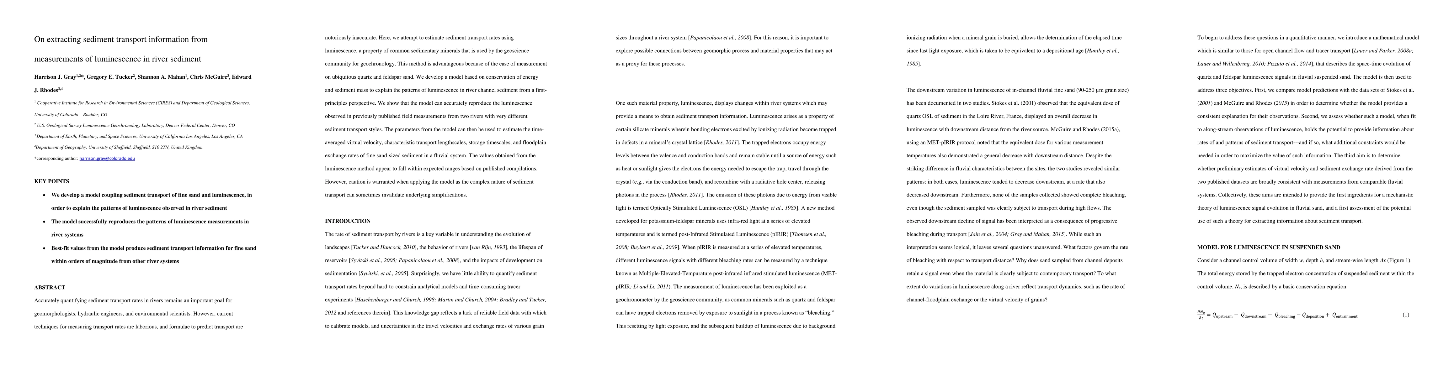 This paper proposes a novel method for estimating sediment transport rates using luminescence measurements in river sediment, demonstrating its accuracy through comparison with field data from two rivers. The developed model based on energy and mass conservation shows promise but requires careful application due to the inherent complexities of sediment transport.