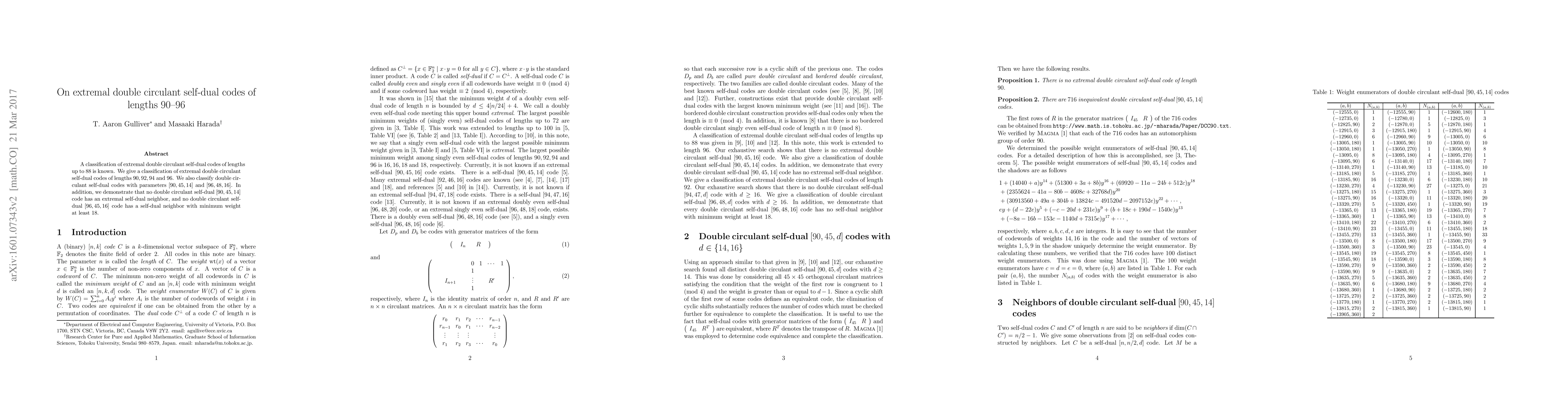 This paper classifies extremal double circulant self-dual codes for lengths 90, 92, 94, and 96, and specifically identifies parameters for $[90,45,14]$ and $[96,48,16]$. It also proves that no extremal self-dual neighbor exists for $[90,45,14]$ and no self-dual neighbor with minimum weight at least 18 exists for $[96,45,16]$.