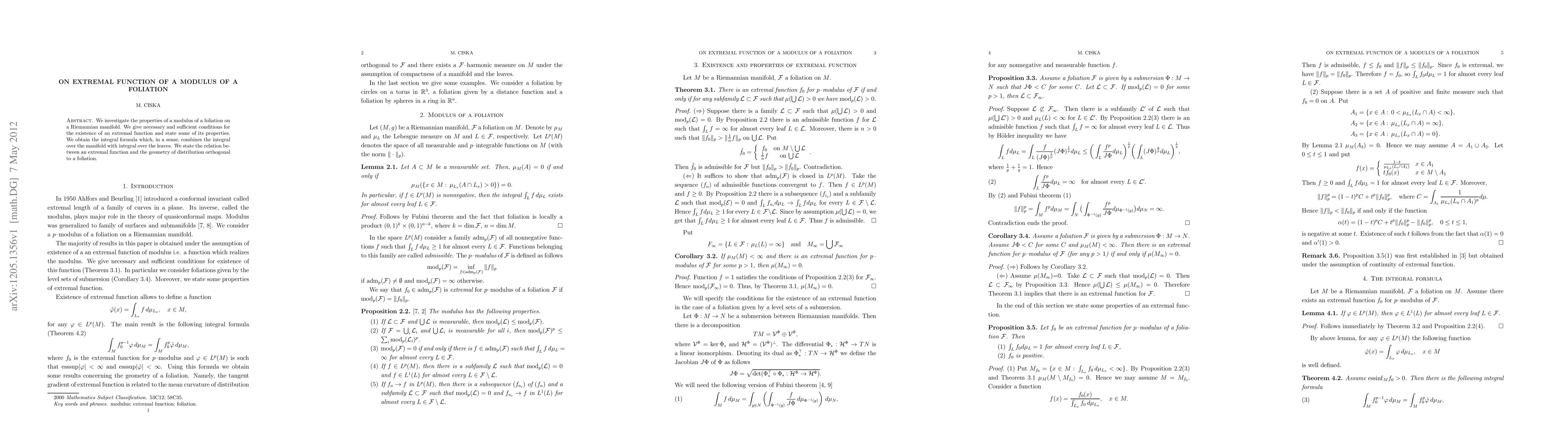We investigate the properties of a modulus of a foliation on a Riemannian manifold. We give necessary and sufficient conditions for the existence of an extremal function and state some of its properties. We obtain the integral formula which, in a sense, combines the integral over the manifold with integral over the leaves. We state the relation between an extremal function and the geometry of distribution orthogonal to a foliation.
