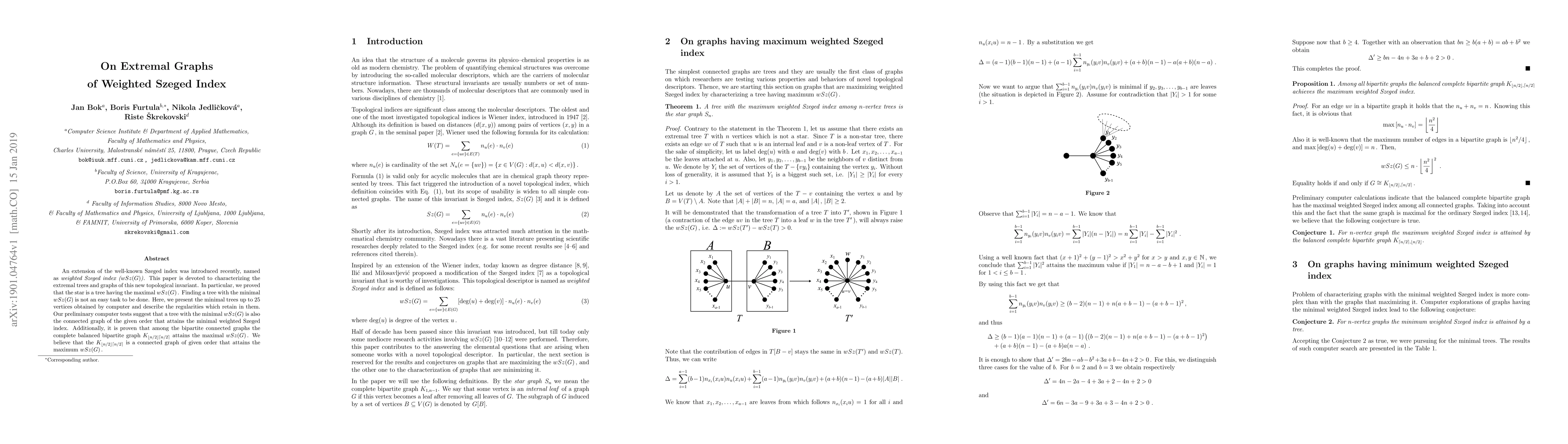 This paper investigates extremal graphs of weighted Szeged index, finding that star trees have the maximum value and bipartite complete balanced graphs achieve a near-maximal value.