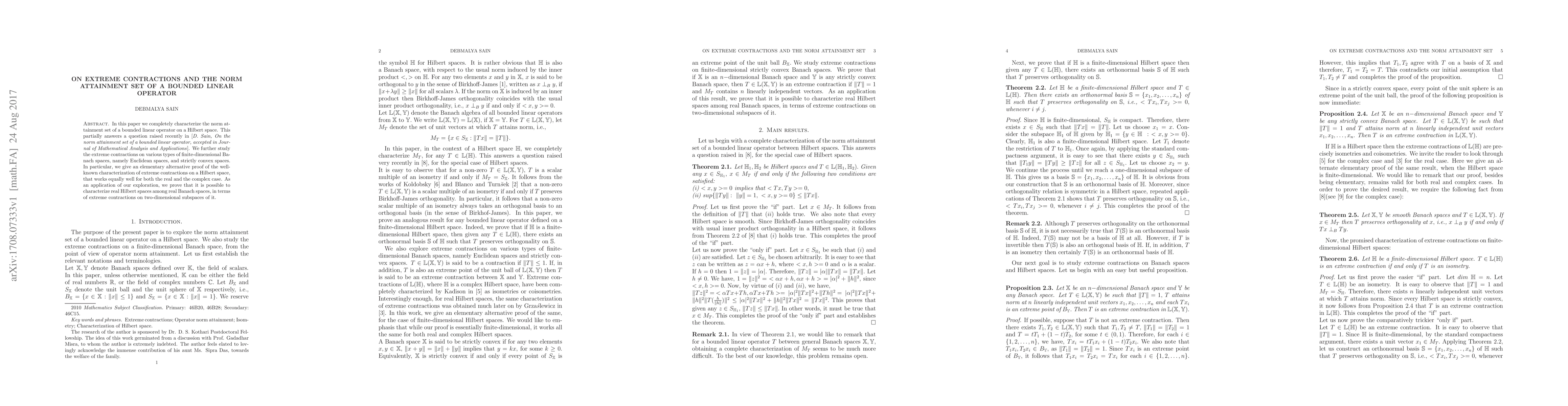 This paper characterizes the norm attainment set of bounded linear operators on Hilbert spaces and provides an elementary proof for extreme contractions on finite-dimensional Banach spaces. It also demonstrates how extreme contractions can distinguish real Hilbert spaces from other Banach spaces.