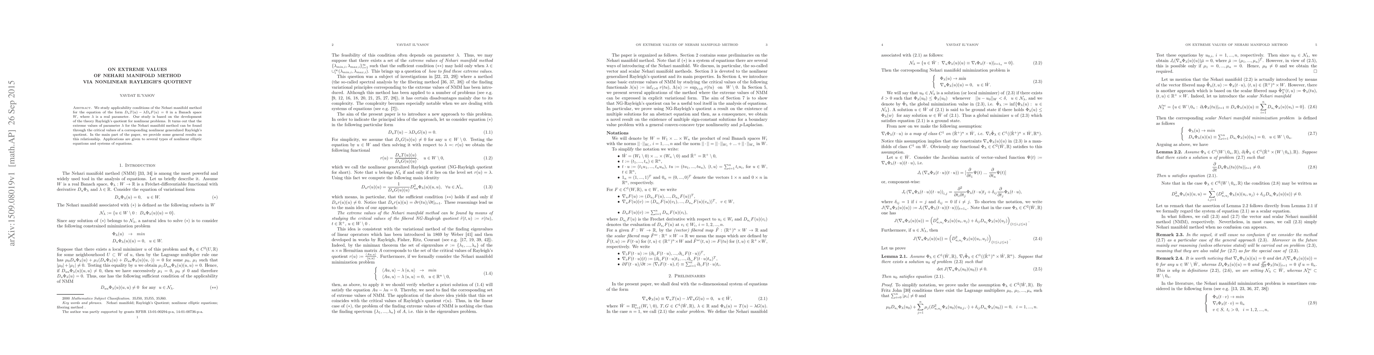 This paper explores the conditions under which the Nehari manifold method is applicable for solving nonlinear equations in Banach spaces. It develops a theory for nonlinear Rayleigh's quotient and demonstrates that extreme values of the parameter λ in the method correspond to critical values of a nonlinear generalized Rayleigh's quotient.