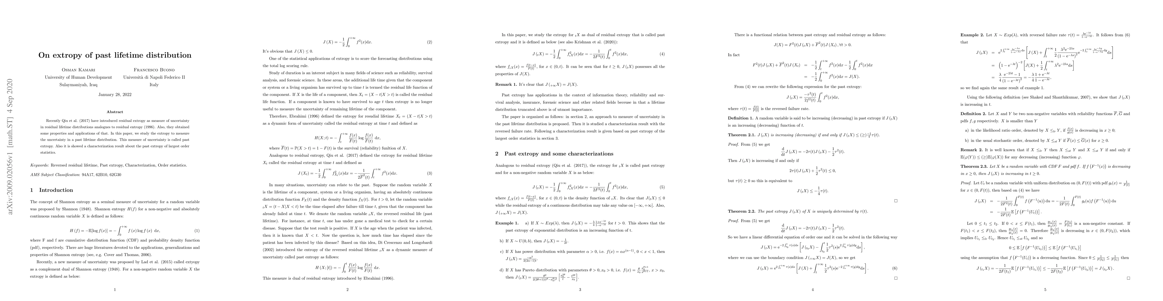 This paper explores the concept of "past extropy" as a measure of uncertainty in past lifetime distributions, analogous to residual extropy. It also presents a characterization result for the past extropy of the largest order statistics.