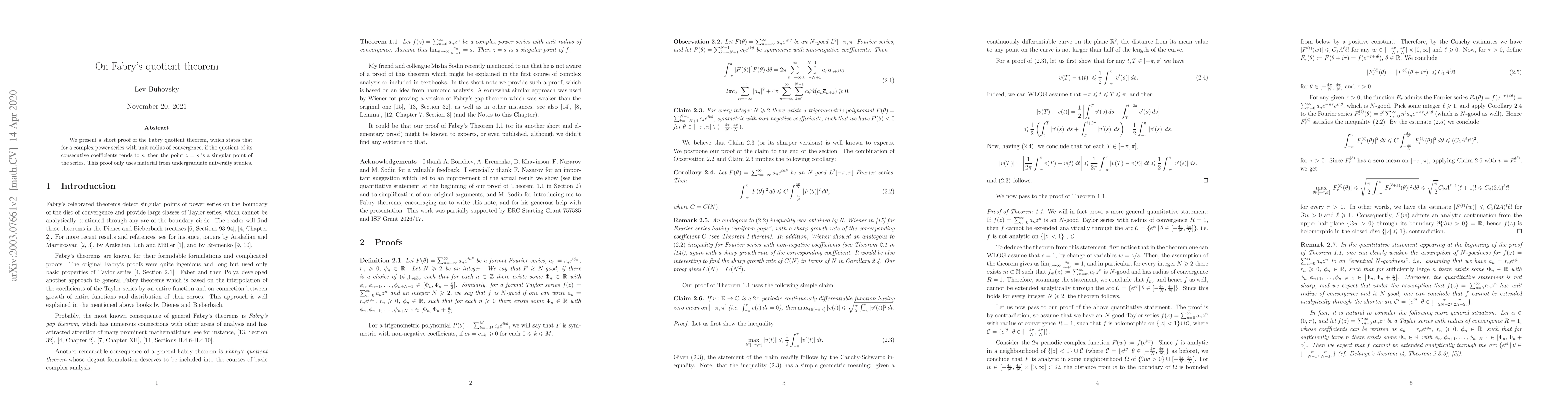 We present a short proof of the Fabry quotient theorem, which states that for a complex power series with unit radius of convergence, if the quotient of its consecutive coefficients tends to $ s $, then the point $ z=s $ is a singular point of the series. This proof only uses material from undergraduate university studies.