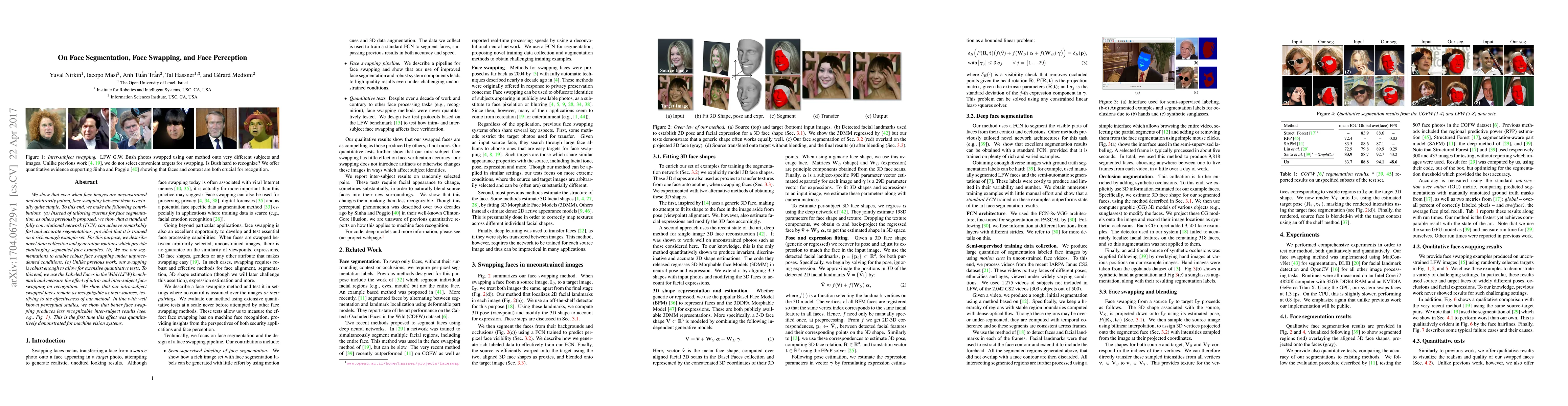 This paper demonstrates that face swapping can be achieved with a standard fully convolutional network for segmentation, even with unconstrained face images, and shows that this method allows for robust face swapping under challenging conditions. The study also quantitatively measures the impact of face swapping on recognition using the LFW benchmark, revealing that intra-subject swaps maintain high recognizability while inter-subject swaps show reduced recognition, a novel finding in machine vision.