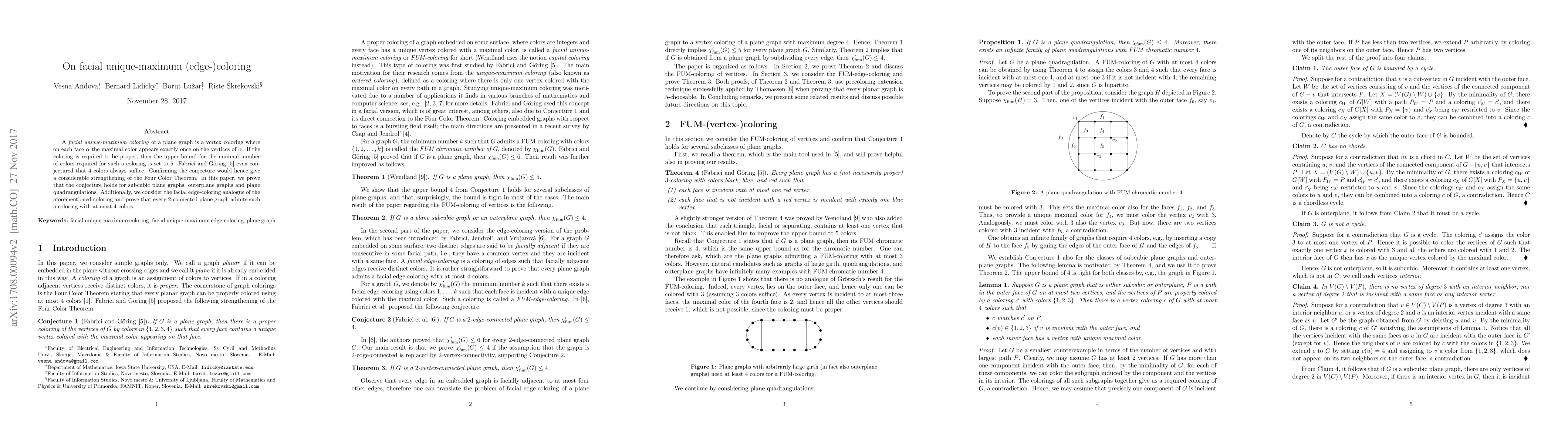 A facial unique-maximum coloring of a plane graph is a vertex coloring where on each face $\alpha$ the maximal color appears exactly once on the vertices of $\alpha$. If the coloring is required to be proper, then the upper bound for the minimal number of colors required for such a coloring is set to $5$. Fabrici and G\"oring [Fabrici and Goring 2016] even conjectured that $4$ colors always suffice. Confirming the conjecture would hence give a considerable strengthening of the Four Color Theorem. In this paper, we prove that the conjecture holds for subcubic plane graphs, outerplane graphs and plane quadrangulations. Additionally, we consider the facial edge-coloring analogue of the aforementioned coloring and prove that every $2$-connected plane graph admits such a coloring with at most $4$ colors.