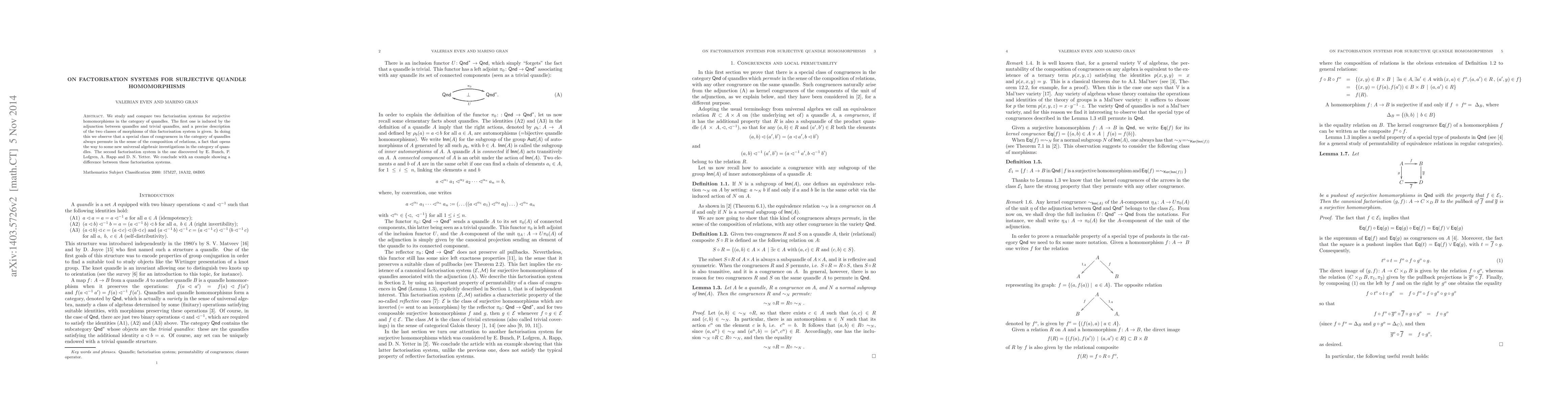This paper investigates two factorisation systems for surjective quandle homomorphisms, detailing the first induced by adjunction between quandles and trivial quandles, and comparing it with the system discovered by Bunch, Lofgren, Rapp, and Yetter. It highlights a new universal algebraic insight regarding congruences in the quandle category.