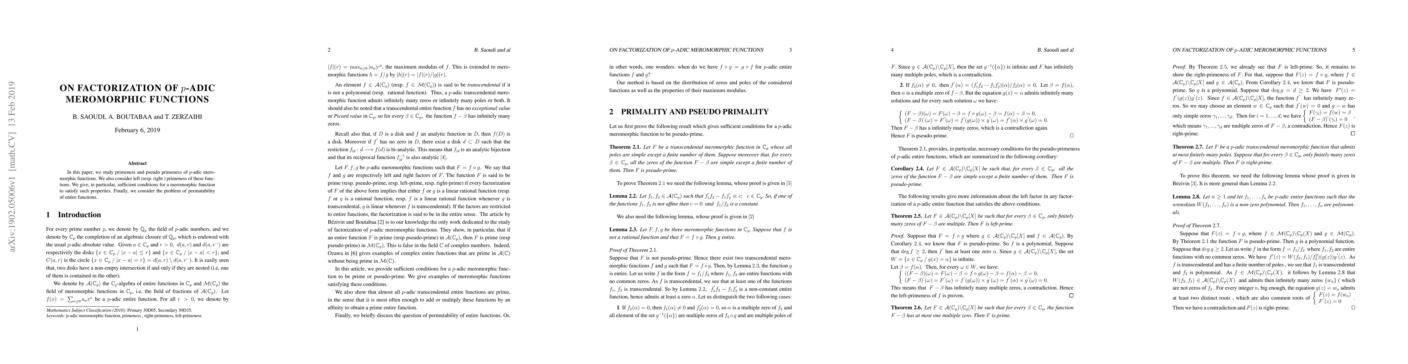 In this paper, we study primeness and pseudo primeness of p-adic meromorphic functions. We also consider left (resp. right ) primeness of these functions. We give, in particular, sufficient conditions for a meromorphic function to satisfy such properties. Finally, we consider the problem of permutability of entire functions.