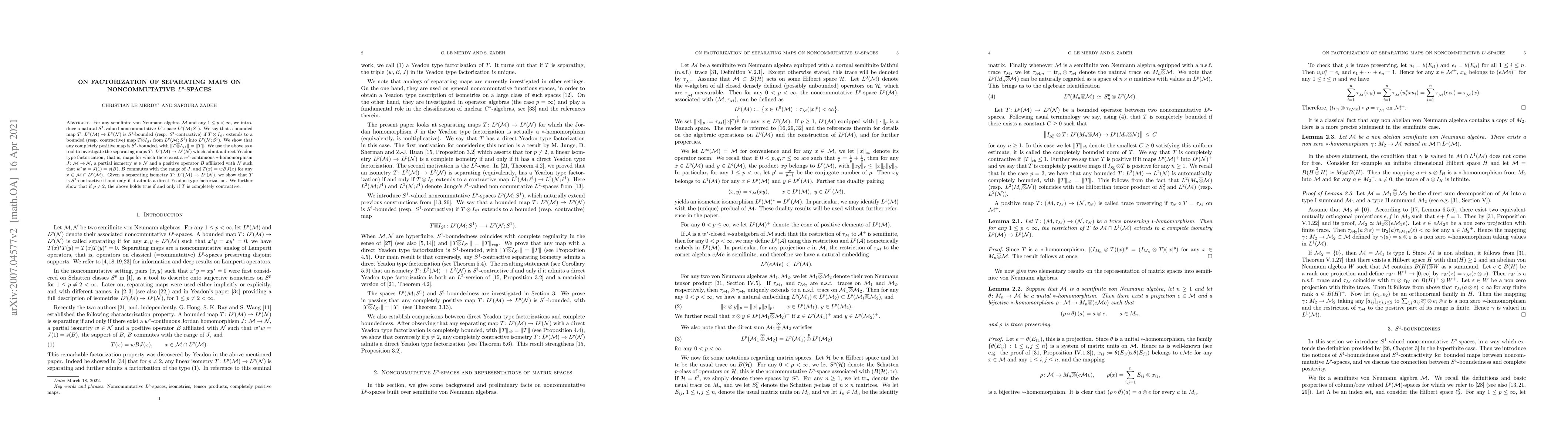 For any semifinite von Neumann algebra ${\mathcal M}$ and any $1\leq p<\infty$, we introduce a natutal $S^1$-valued noncommutative $L^p$-space $L^p({\mathcal M};S^1)$. We say that a bounded map $T\colon L^p({\mathcal M})\to L^p({\mathcal N})$ is $S^1$-bounded (resp. $S^1$-contractive) if $T\otimes I_{S^1}$ extends to a bounded (resp. contractive) map $T\overline{\otimes} I_{S^1}$ from $ L^p({\mathcal M};S^1)$ into $L^p({\mathcal N};S^1)$. We show that any completely positive map is $S^1$-bounded, with $\Vert T\overline{\otimes} I_{S^1}\Vert =\Vert T\Vert$. We use the above as a tool to investigate the separating maps $T\colon L^p({\mathcal M})\to L^p({\mathcal N})$ which admit a direct Yeadon type factorization, that is, maps for which there exist a $w^*$-continuous $*$-homomorphism $J\colon{\mathcal M}\to{\mathcal N}$, a partial isometry $w\in{\mathcal N}$ and a positive operator $B$ affiliated with ${\mathcal N}$ such that $w^*w=J(1)=s(B)$, $B$ commutes with the range of $J$, and $T(x)=wBJ(x)$ for any $x\in {\mathcal M}\cap L^p({\mathcal M})$. Given a separating isometry $T\colon L^p({\mathcal M})\to L^p({\mathcal N})$, we show that $T$ is $S^1$-contractive if and only if it admits a direct Yeadon type factorization. We further show that if $p\not=2$, the above holds true if and only if $T$ is completely contractive.