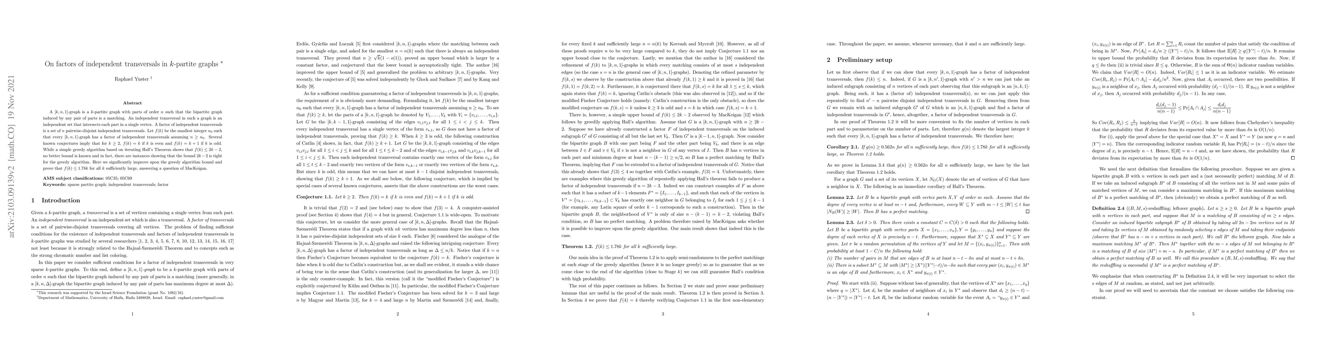 This paper investigates the existence of factors of independent transversals in $[k,n,1]$-graphs, proving that $f(k) \le 1.78k$ for sufficiently large $k$, significantly improving previous bounds and addressing a conjectured value of $f(k)$. The result resolves the tightness of the earlier $2k-2$ bound for a greedy algorithm.