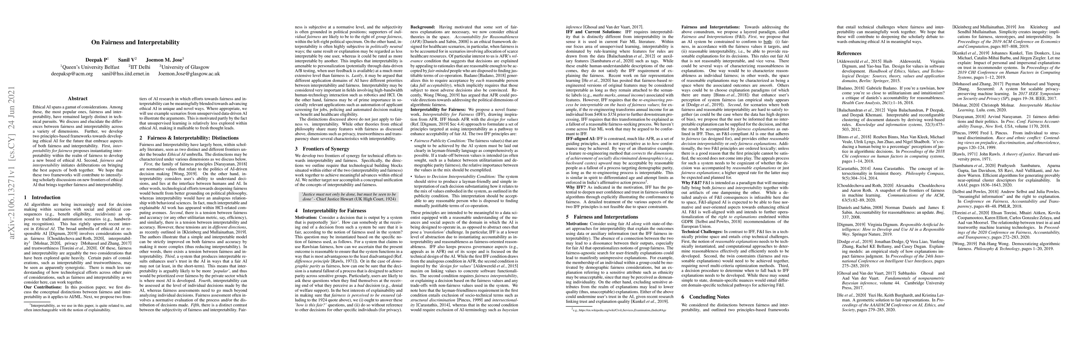 Ethical AI spans a gamut of considerations. Among these, the most popular ones, fairness and interpretability, have remained largely distinct in technical pursuits. We discuss and elucidate the differences between fairness and interpretability across a variety of dimensions. Further, we develop two principles-based frameworks towards developing ethical AI for the future that embrace aspects of both fairness and interpretability. First, interpretability for fairness proposes instantiating interpretability within the realm of fairness to develop a new breed of ethical AI. Second, fairness and interpretability initiates deliberations on bringing the best aspects of both together. We hope that these two frameworks will contribute to intensifying scholarly discussions on new frontiers of ethical AI that brings together fairness and interpretability.