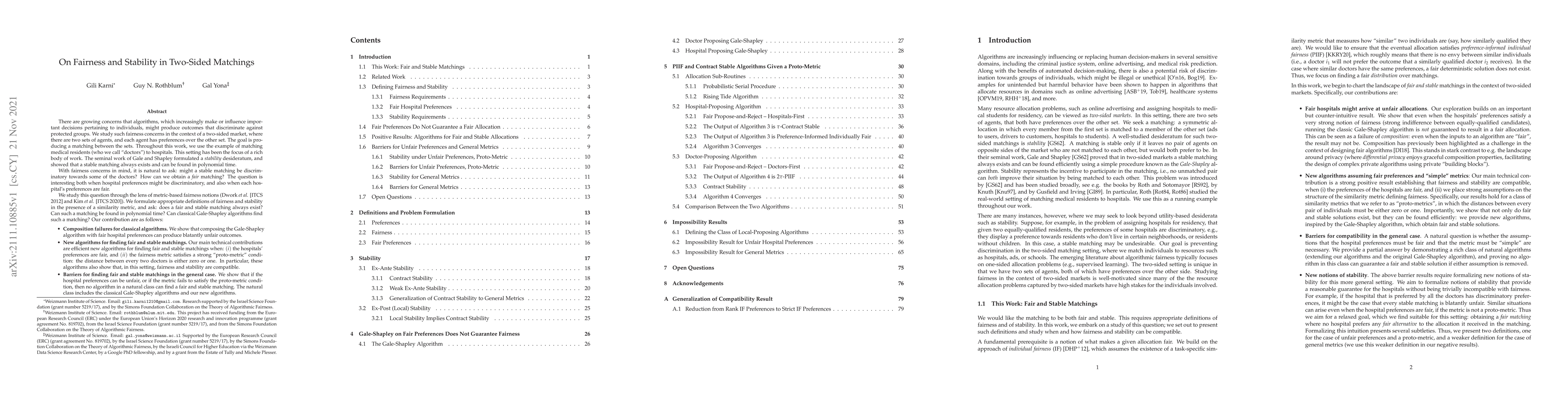 There are growing concerns that algorithms, which increasingly make or influence important decisions pertaining to individuals, might produce outcomes that discriminate against protected groups. We study such fairness concerns in the context of a two-sided market, where there are two sets of agents, and each agent has preferences over the other set. The goal is producing a matching between the sets. This setting has been the focus of a rich body of work. The seminal work of Gale and Shapley formulated a stability desideratum, and showed that a stable matching always exists and can be found efficiently. We study this question through the lens of metric-based fairness notions (Dwork et al., Kim et al.). We formulate appropriate definitions of fairness and stability in the presence of a similarity metric, and ask: does a fair and stable matching always exist? Can such a matching be found in polynomial time? Our contributions are as follows: (1) Composition failures for classical algorithms: We show that composing the Gale-Shapley algorithm with fair hospital preferences can produce blatantly unfair outcomes. (2) New algorithms for finding fair and stable matchings: Our main technical contributions are efficient new algorithms for finding fair and stable matchings when: (i) the hospitals' preferences are fair, and (ii) the fairness metric satisfies a strong "proto-metric" condition: the distance between every two doctors is either zero or one. In particular, these algorithms also show that, in this setting, fairness and stability are compatible. (3) Barriers for finding fair and stable matchings in the general case: We show that if the hospital preferences can be unfair, or if the metric fails to satisfy the proto-metric condition, then no algorithm in a natural class can find a fair and stable matching. The natural class includes the classical Gale-Shapley algorithms and our new algorithms.