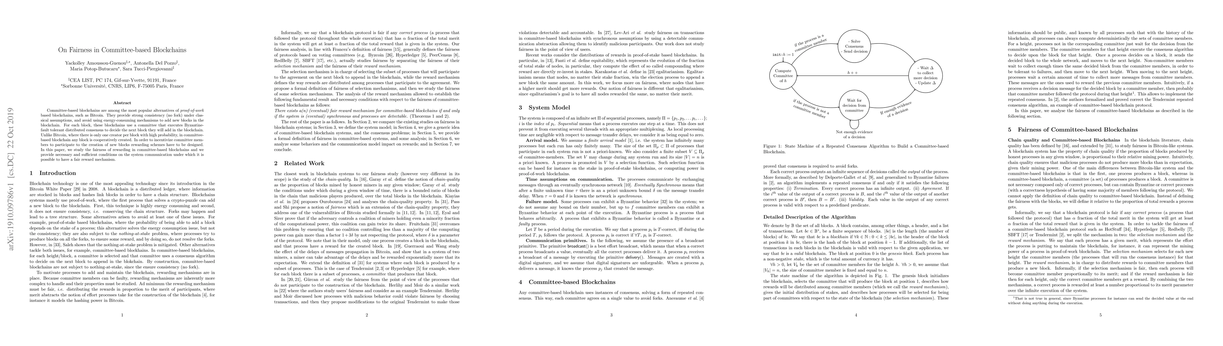 Committee-based blockchains are among the most popular alternatives of proof-of-work based blockchains, such as Bitcoin. They provide strong consistency (no fork) under classical assumptions, and avoid using energy-consuming mechanisms to add new blocks in the blockchain. For each block, these blockchains use a committee that executes Byzantine-fault tolerant distributed consensus to decide the next block they will add in the blockchain. Unlike Bitcoin, where there is only one creator per block with high probability, in committee-based blockchain any block is cooperatively created. In order to incentivize committee members to participate to the creation of new blocks rewarding schemes have to be designed. In this paper, we study the fairness of rewarding in committee-based blockchains and we provide necessary and sufficient conditions on the system communication under which it is possible to have a fair reward mechanism.