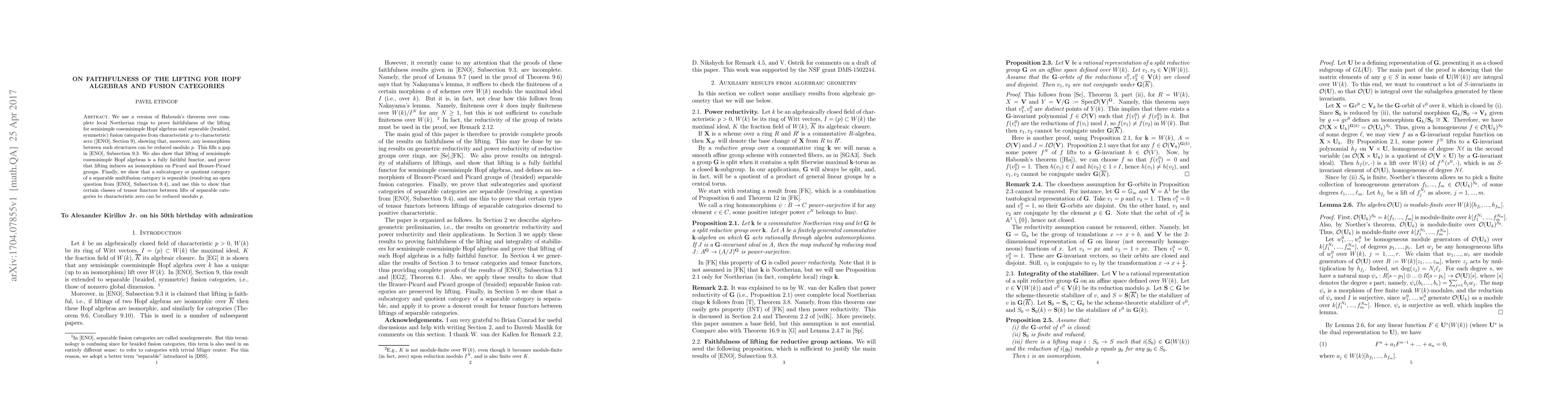 We use a version of Haboush's theorem over complete local Noetherian rings to prove faithfulness of the lifting for semisimple cosemisimple Hopf algebras and separable (braided, symmetric) fusion categories from characteristic $p$ to characteristic zero (arXiv/math:0203060, Section 9), showing that, moreover, any isomorphism between such structures can be reduced modulo $p$. This fills a gap in arXiv/math:0203060, Subsection 9.3. We also show that lifting of semisimple cosemisimple Hopf algebras is a fully faithful functor, and prove that lifting induces an isomorphism on Picard and Brauer-Picard groups. Finally, we show that a subcategory or quotient category of a separable multifusion category is separable (resolving an open question from arXiv/math:0203060, Subsection 9.4), and use this to show that certain classes of tensor functors between lifts of separable categories to characteristic zero can be reduced modulo $p$.