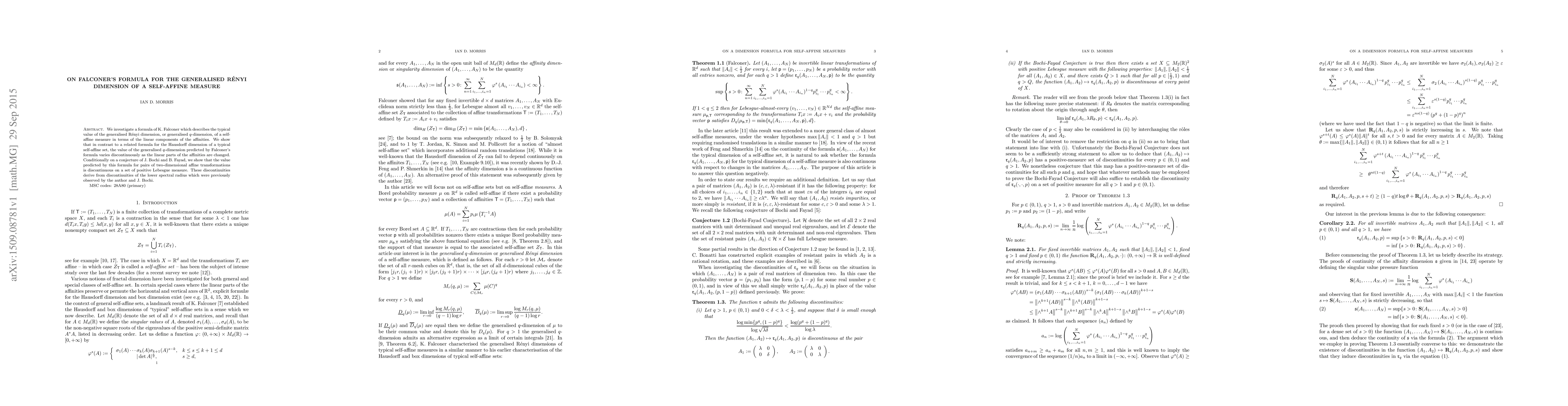 We investigate a formula of K. Falconer which describes the typical value of the generalised R\'enyi dimension, or generalised $q$-dimension, of a self-affine measure in terms of the linear components of the affinities. We show that in contrast to a related formula for the Hausdorff dimension of a typical self-affine set, the value of the generalised $q$-dimension predicted by Falconer's formula varies discontinuously as the linear parts of the affinities are changed. Conditionally on a conjecture of J. Bochi and B. Fayad, we show that the value predicted by this formula for pairs of two-dimensional affine transformations is discontinuous on a set of positive Lebesgue measure. These discontinuities derive from discontinuities of the lower spectral radius which were previously observed by the author and J. Bochi.