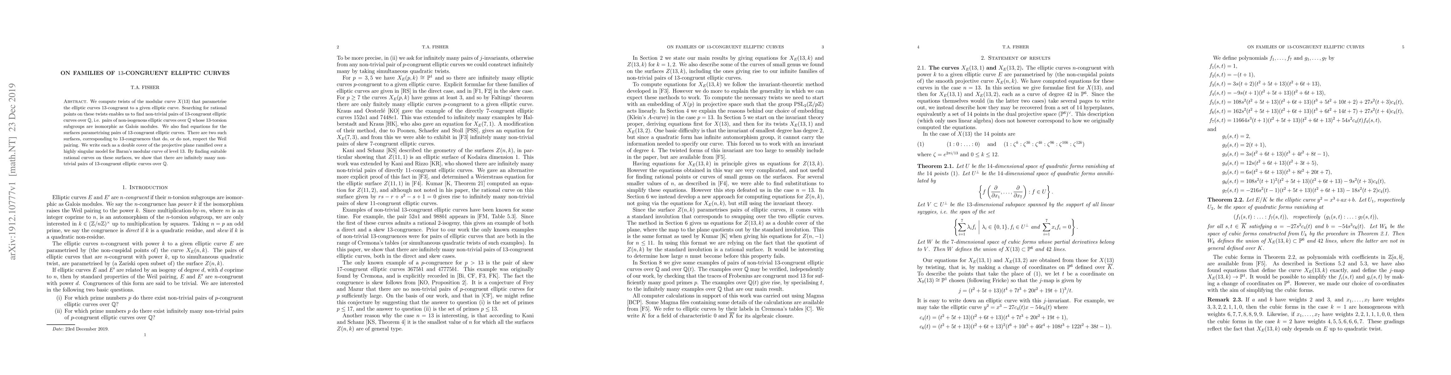 This paper explores the families of elliptic curves that are 13-congruent to a given curve, finding non-trivial pairs over rational numbers. It also identifies two surfaces parametrizing these pairs, proving the existence of infinitely many such pairs through rational curves on these surfaces.
