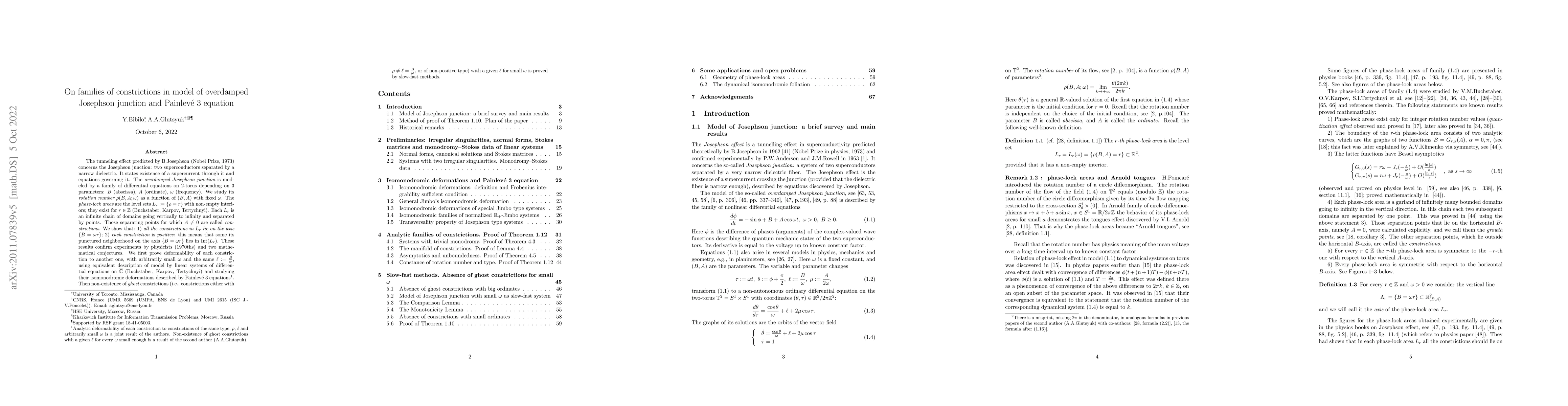 The tunneling effect predicted by B.Josephson (Nobel Prize, 1973) concerns the Josephson junction: two superconductors separated by a narrow dielectric. It states existence of a supercurrent through it and equations governing it. The overdamped Josephson junction is modeled by a family of differential equations on 2-torus depending on 3 parameters: $B$ (abscissa), $A$ (ordinate), $\omega$ (frequency). We study its rotation number $\rho(B,A;\omega)$ as a function of $(B,A)$ with fixed $\omega$. The phase-lock areas are the level sets $L_r:=\{\rho=r\}$ with non-empty interiors; they exist for $r\in\mathbb Z$ (Buchstaber, Karpov, Tertychnyi). Each $L_r$ is an infinite chain of domains going vertically to infinity and separated by points called constrictions (expect for those with $A=0$). We show that: 1) all the constrictions in $L_r$ lie in its axis $\{ B=\omega r\}$ (confirming a conjecture of Tertychnyi, Kleptsyn, Filimonov, Schurov); 2) each constriction is positive: some its punctured neighborhood in the vertical line lies in $\operatorname{Int}(L_r)$ (confirming another conjecture). We first prove deformability of each constriction to another one, with arbitrarily small $\omega$, of the same $\rho$, $\ell:=\frac B\omega$ and type (positive or not), using equivalent description of model by linear systems of differential equations on $\bar{\mathbb C}$ (Buchstaber, Karpov, Tertychnyi) and studying their isomonodromic deformations described by Painlev\'e 3 equations. Then non-existence of ghost constrictions (i.e., constrictions either with $\rho\neq\ell$, or of non-positive type) with a given $\ell$ for small $\omega$ is proved by slow-fast methods. In Section 6 we present applications of results and elaborated methods and open problems.
