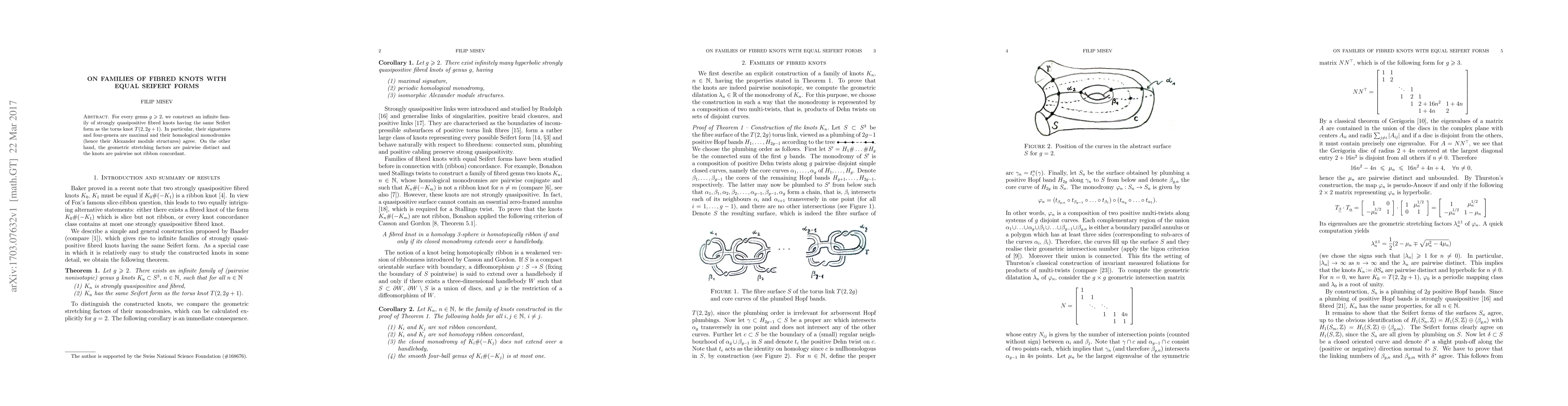 For every genus $g\geq 2$, we construct an infinite family of strongly quasipositive fibred knots having the same Seifert form as the torus knot $T(2,2g+1)$. In particular, their signatures and four-genera are maximal and their homological monodromies (hence their Alexander module structures) agree. On the other hand, the geometric stretching factors are pairwise distinct and the knots are pairwise not ribbon concordant.