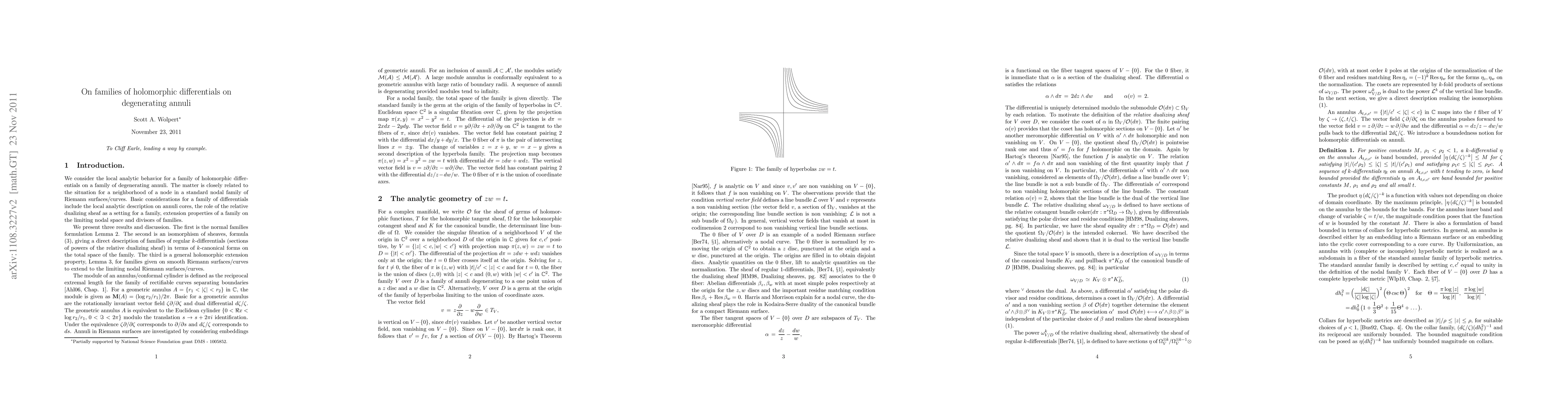 This paper studies the local analytic behavior of holomorphic differentials on degenerating annuli, presenting three key results: a normal families lemma, an isomorphism of sheaves describing regular differentials, and a holomorphic extension property for families on smooth Riemann surfaces extending to nodal limits. It also discusses divisors of these differential families.