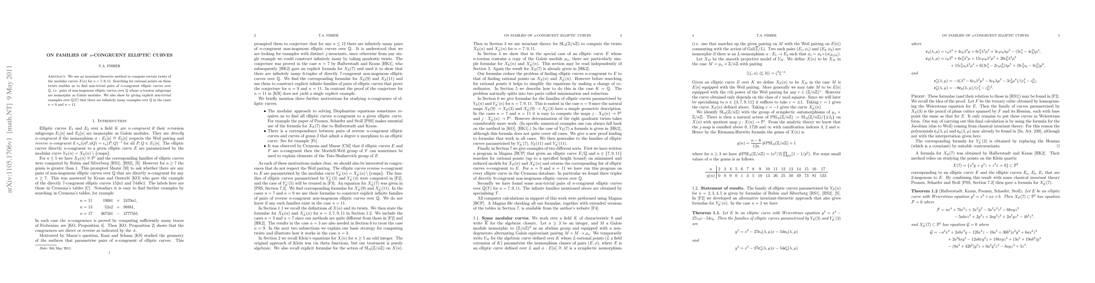 This paper employs invariant-theoretic methods to compute twists of modular curves X(n) for n=7,9,11, revealing non-trivial pairs of n-congruent elliptic curves over Q. It demonstrates the existence of infinitely many such pairs for n=9 and n=11 over Q.